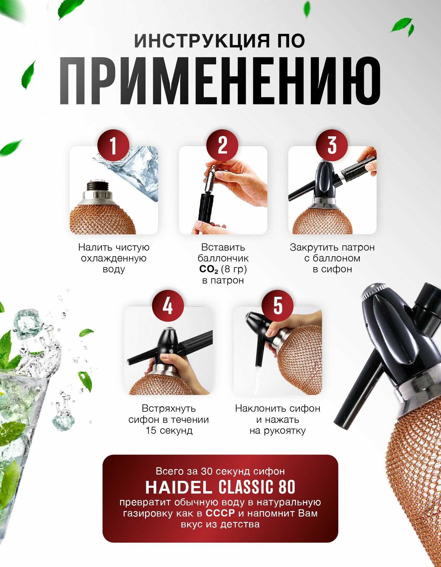 Сифон для газирования воды, стеклянный, 10 баллончиков + сироп для приготовления 5 л натурального лимонада, HAIDEL Classic 80, металлическая оплетка из нержавеющей стали