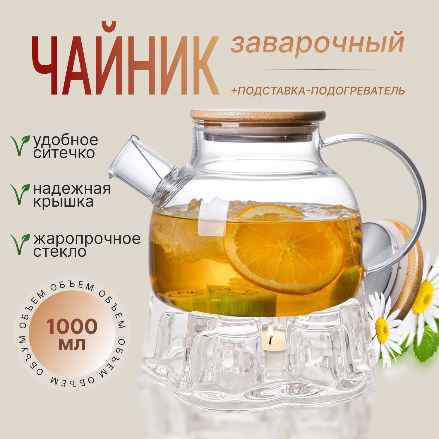 Купить Заварочный чайник с бамбуковой крышкой и подставкой из стекла + свеча