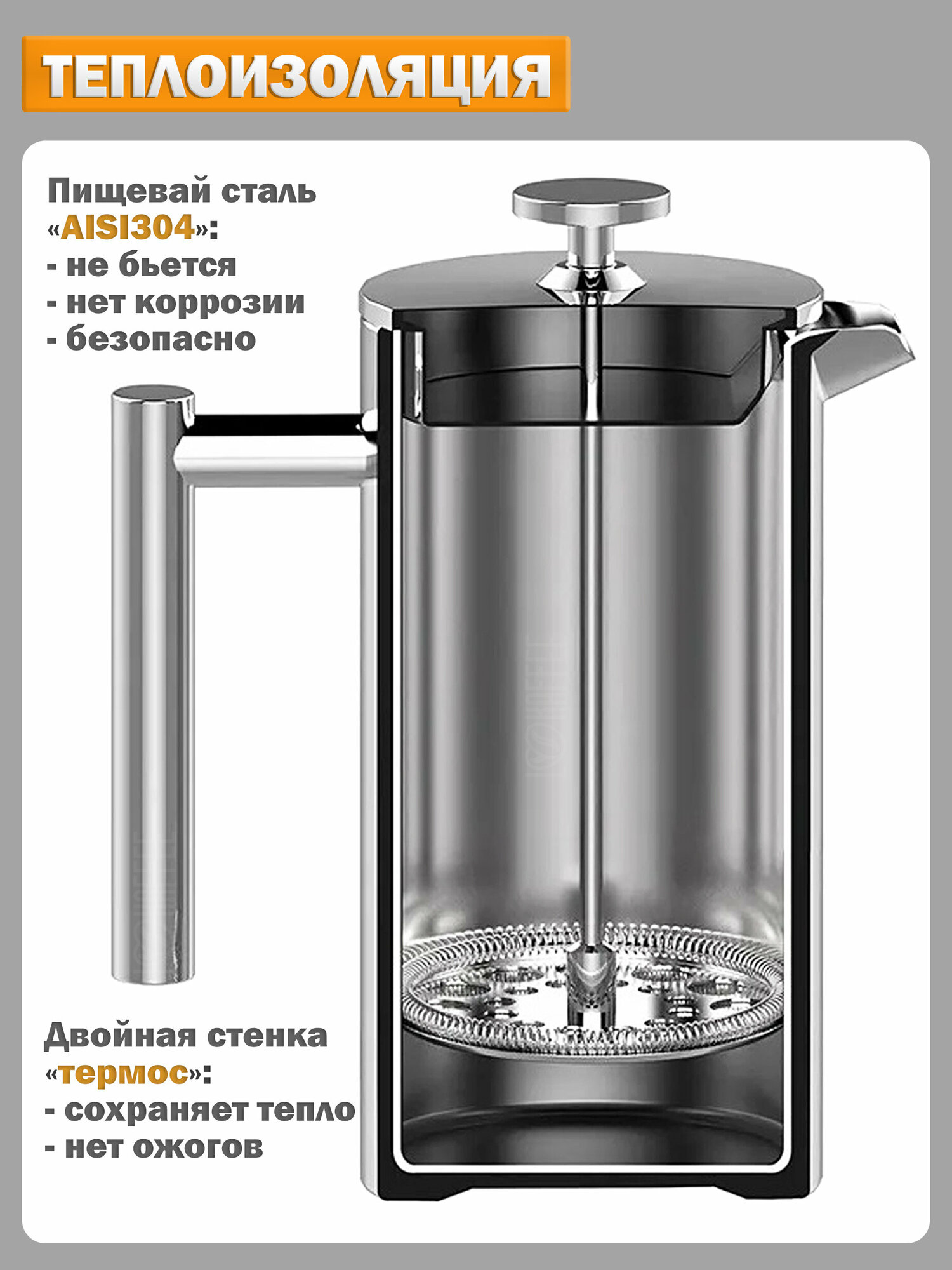 Кофейник AUGUSTIN WELZ с функцией френч-пресса AW-2000 из нержавеющей стали и двойными стенками 1 л