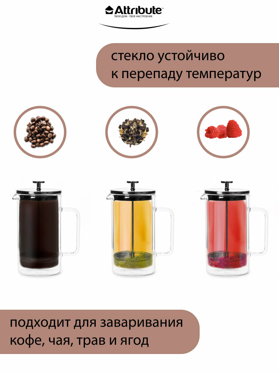 Френч-пресс для горячих напитков Attribute DOUBLE WALL 1000мл+аксессуары