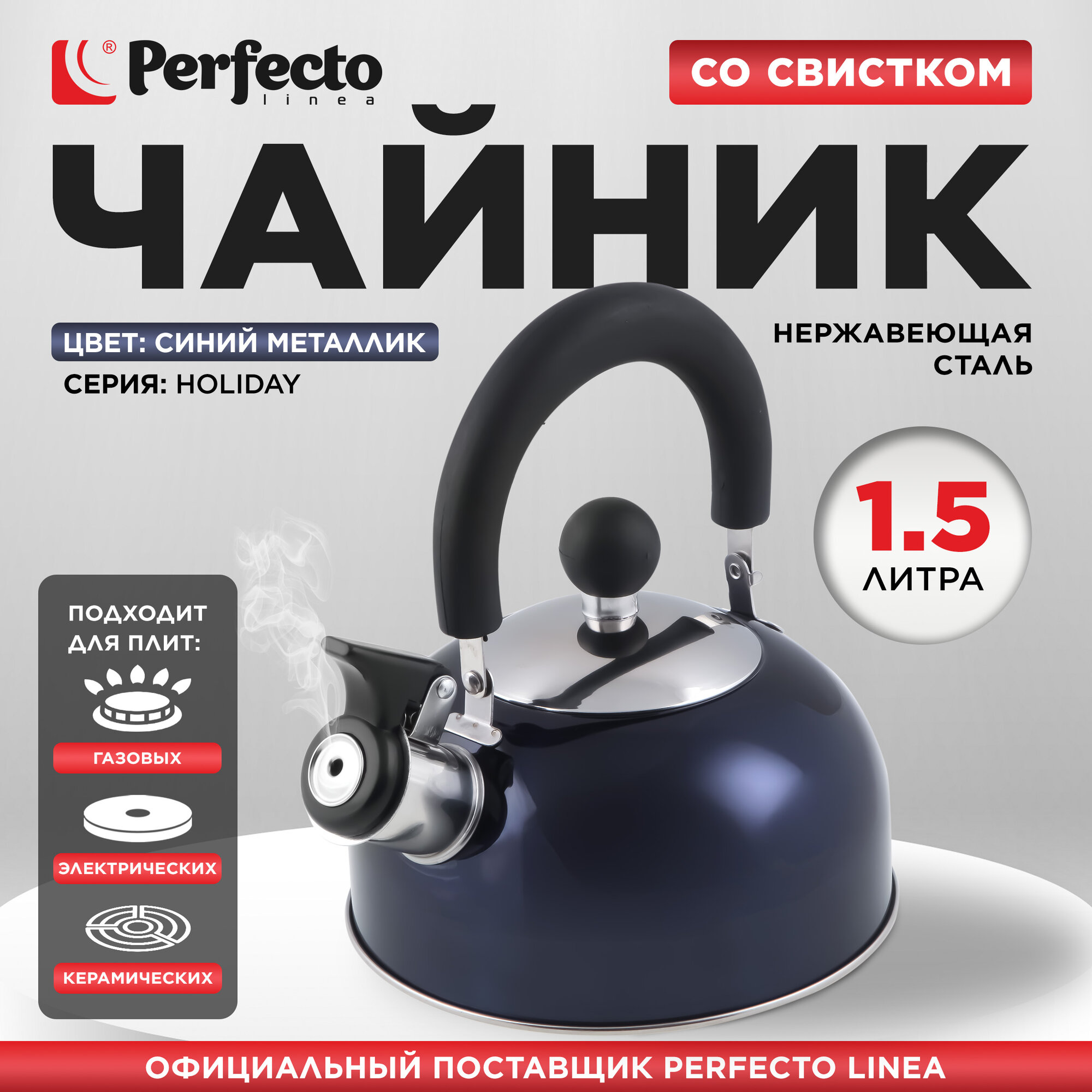 Чайник со свистком 1.5 л PERFECTO LINEA серия Holiday, нержавеющая сталь, цвет синий металлик (52-112016)