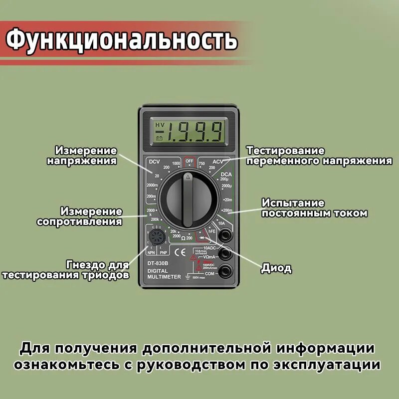| Дополнительная информация | Звуковая прозвонка цепи; тестер транзисторов и диодов; подсветка экрана; |