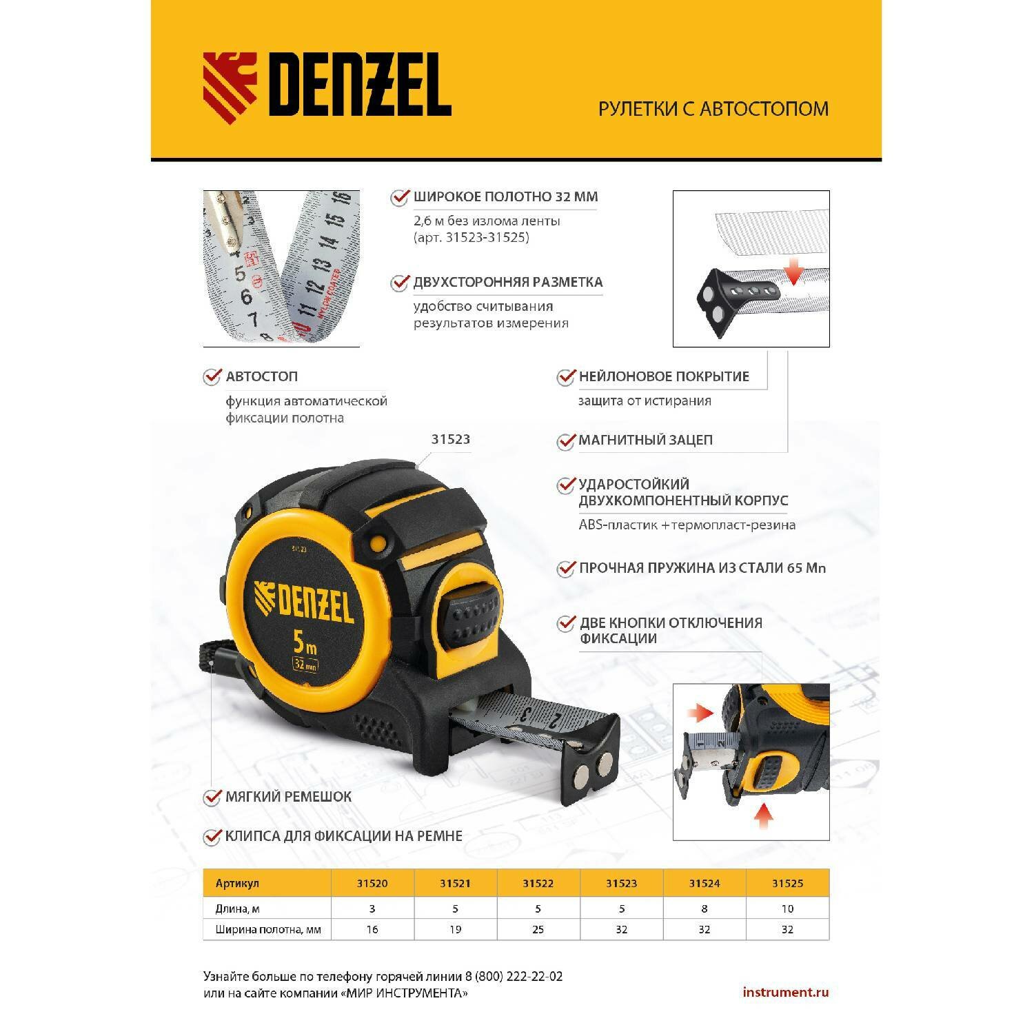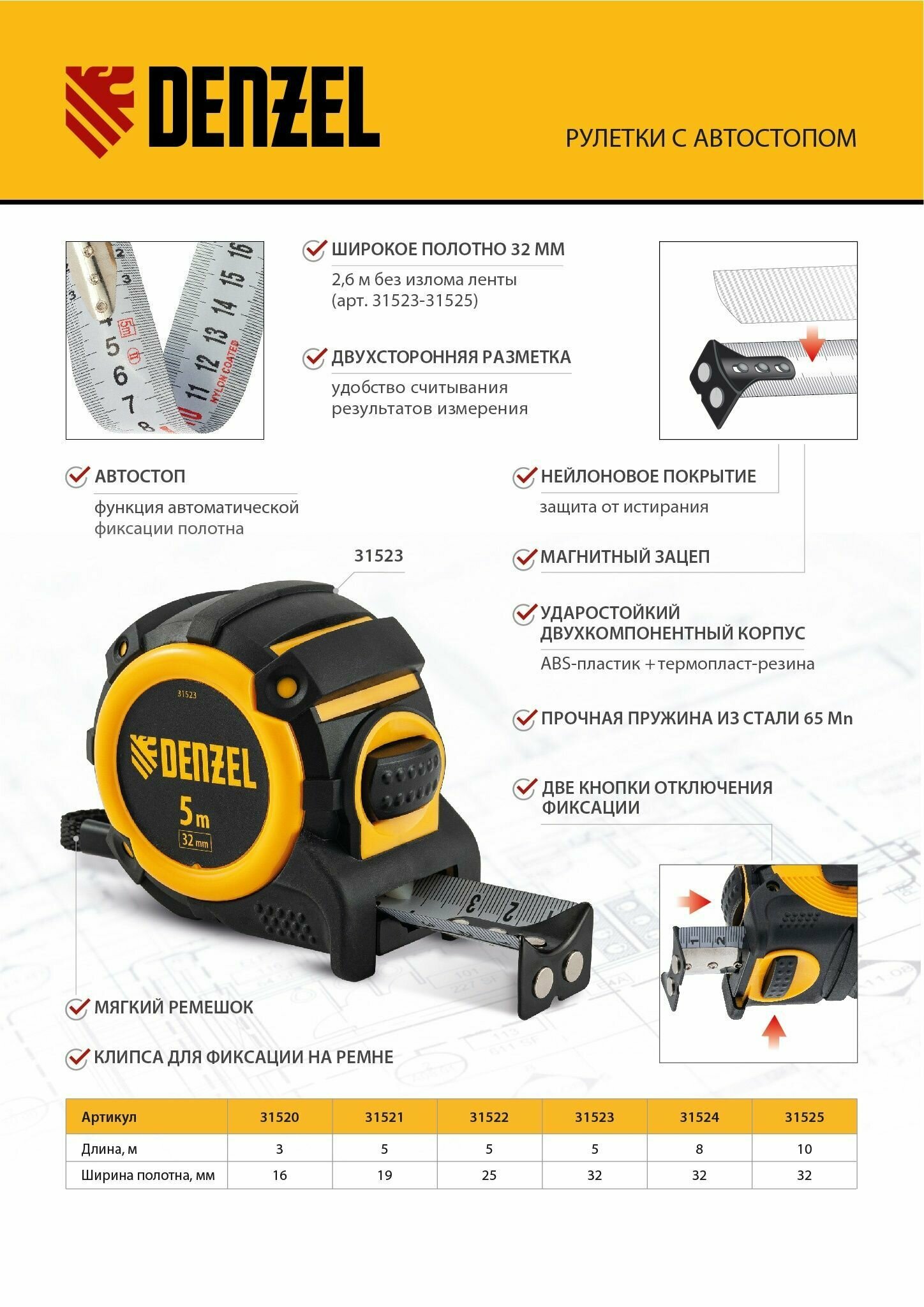 Рулетка Denzel 5м х 32ммавтоматич. фиксац., нейлон. покрытие, магнит. зацеп, двухстор. разметка 31523