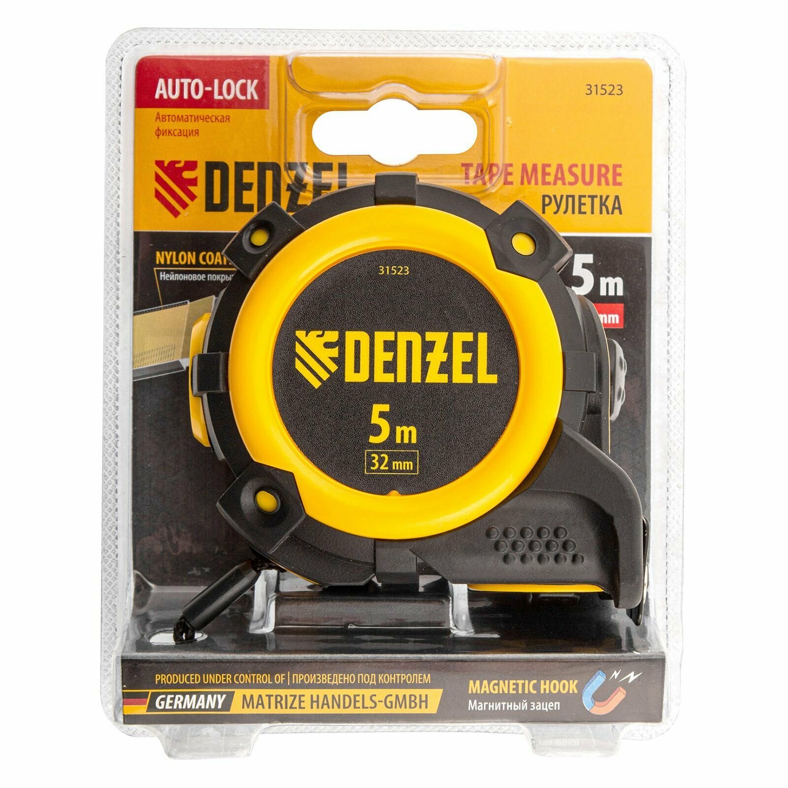 Рулетка Denzel 5м х 32мм, автоматич. фиксац, нейлон. покрытие, магнит. зацеп, двухстор. разметка, 31523