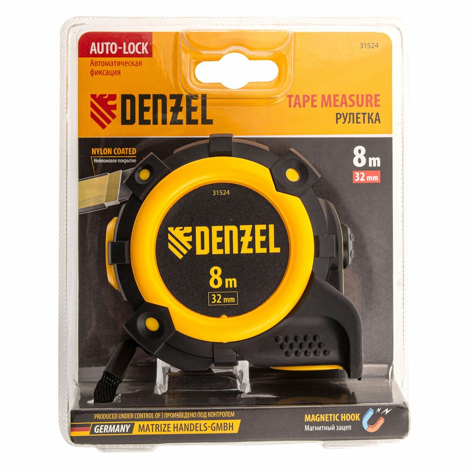 Рулетка 8м х 32мм, автоматич. фиксац, нейлон. покрытие, магнит. зацеп, двухстор. разметка Denzel, 31524
