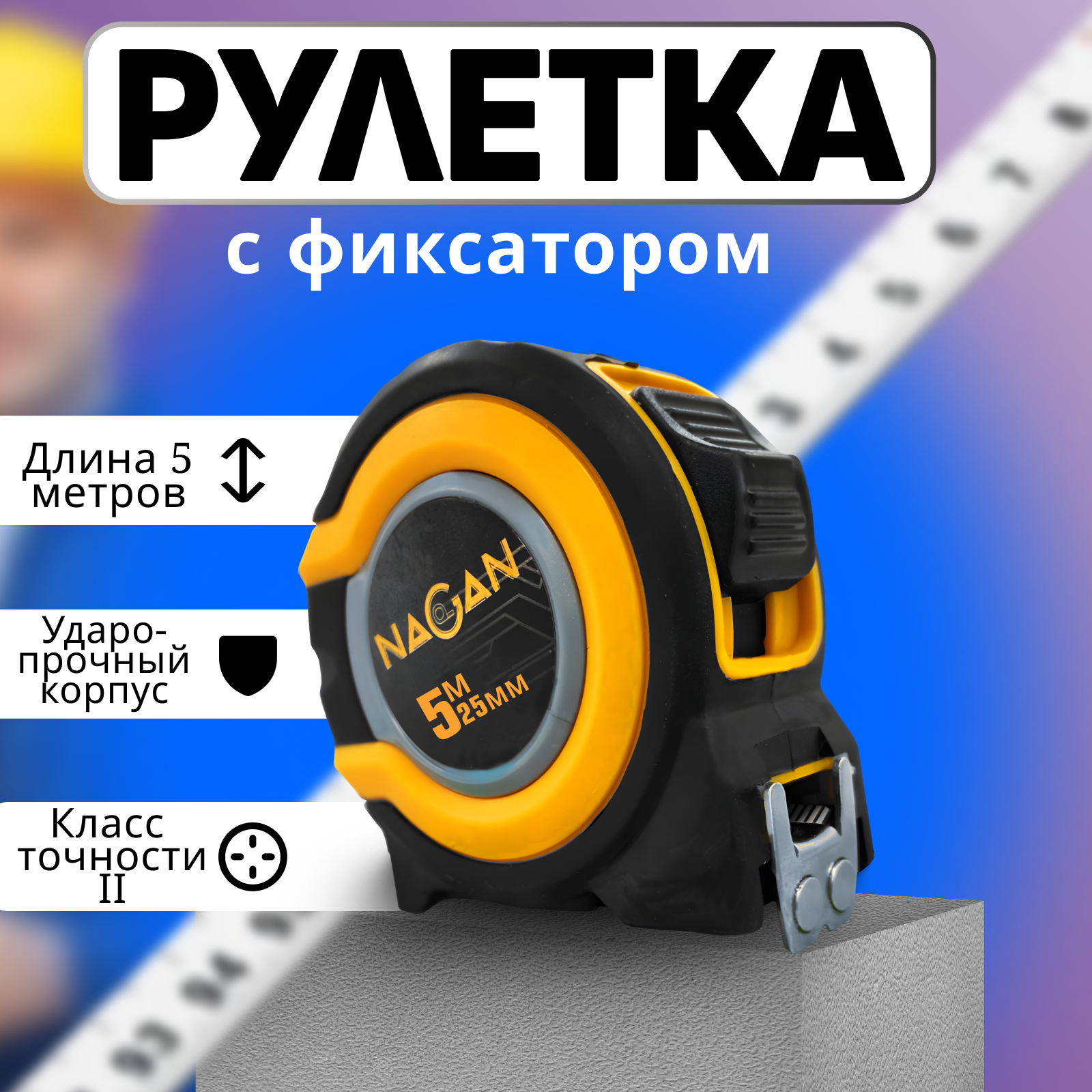 Купить Рулетка строительная с фиксатором 5м * 25 мм в противоударном корпусе
