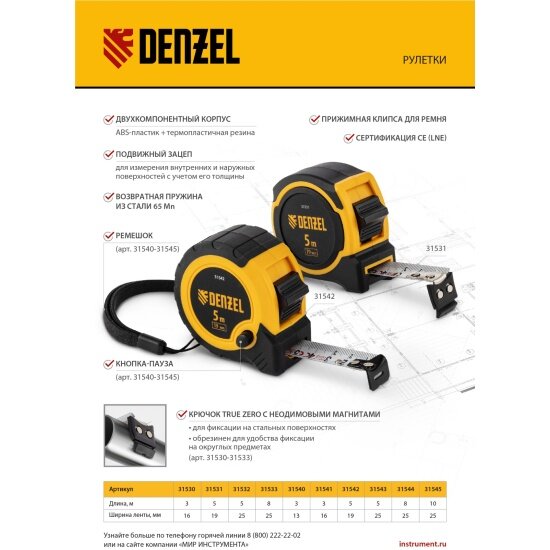 Рулетка Button pause,8м х 25мм /// DENZEL интересное: