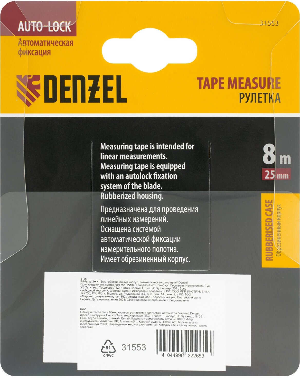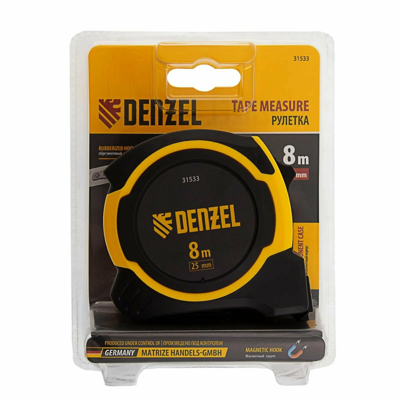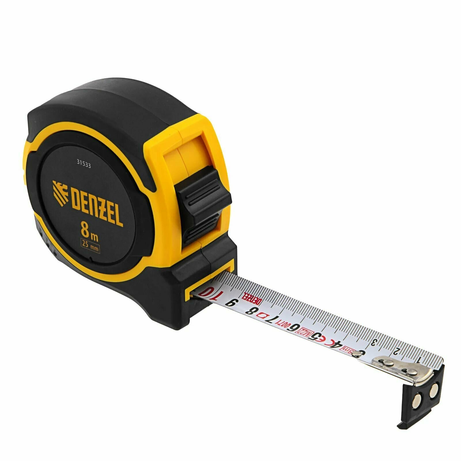 Рулетка Denzel 8м х 25мм обрезиненный корпус, автоматическая фиксация 31553