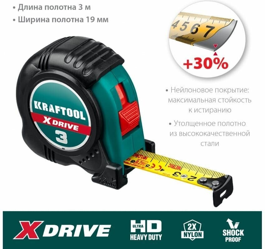 Рулетка X-Drive KRAFTOOL 3 м х 19 мм, ударостойкий обрезиненный корпус