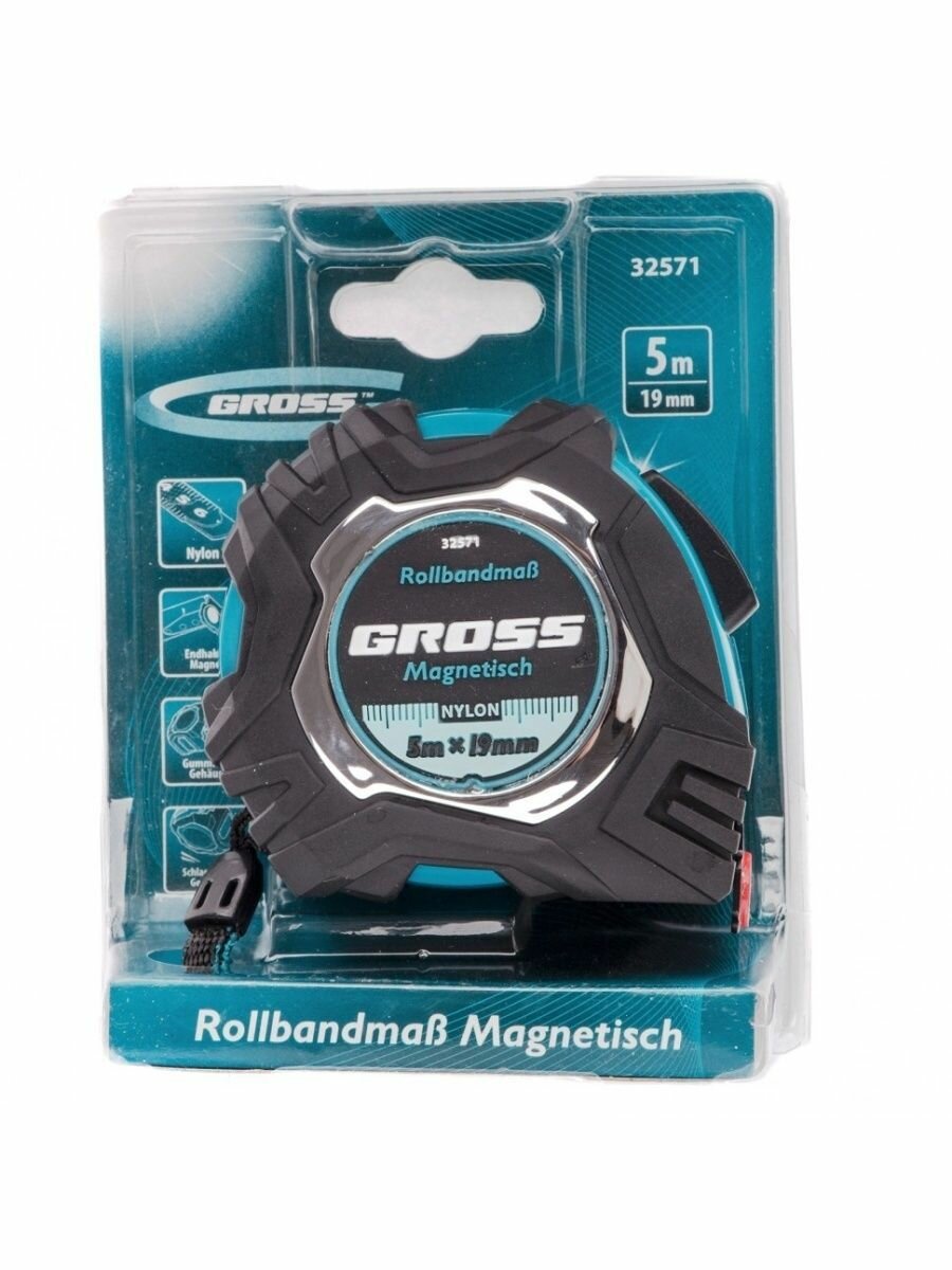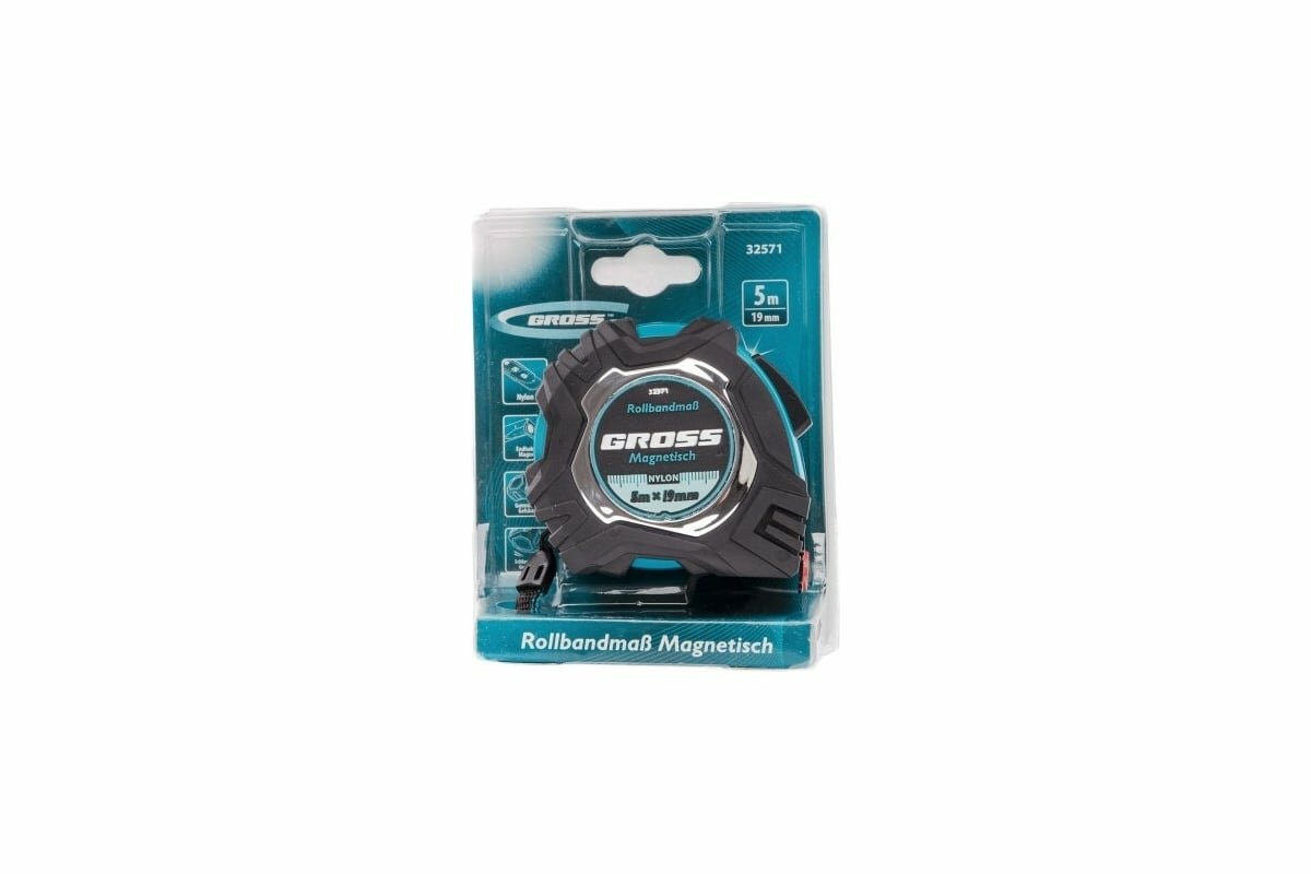 Рулетка Gross Magnetisch 5м х 19мм, обрезин. корпус, автоматич. фиксация, нейлон. покр., магн.зацеп 32571