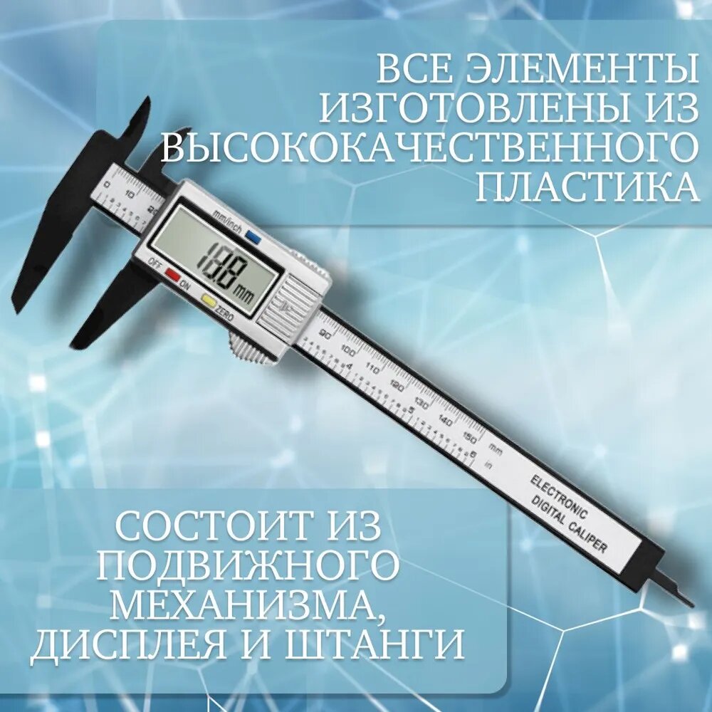 Штангенциркуль цифровой с жк дисплеем из углеводородного волокна 0-150 мм, шаг 0.1 мм, глубиномер + батарейка LR44. интересное: