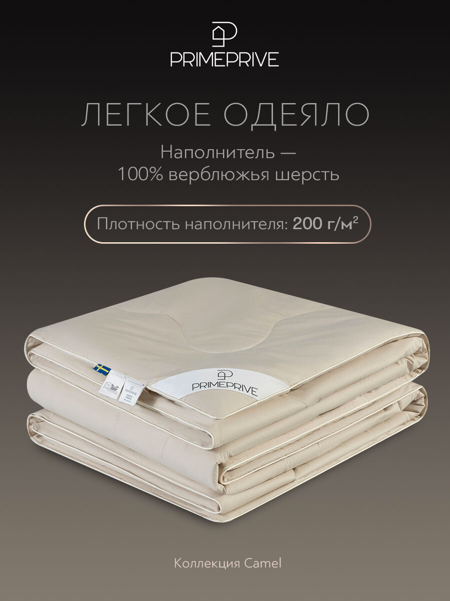 PRIME PRIVE Одеяло двуспальное, всесезонное "Camel" облегченное 200 г/м2, верблюжья шерсть, 172x205