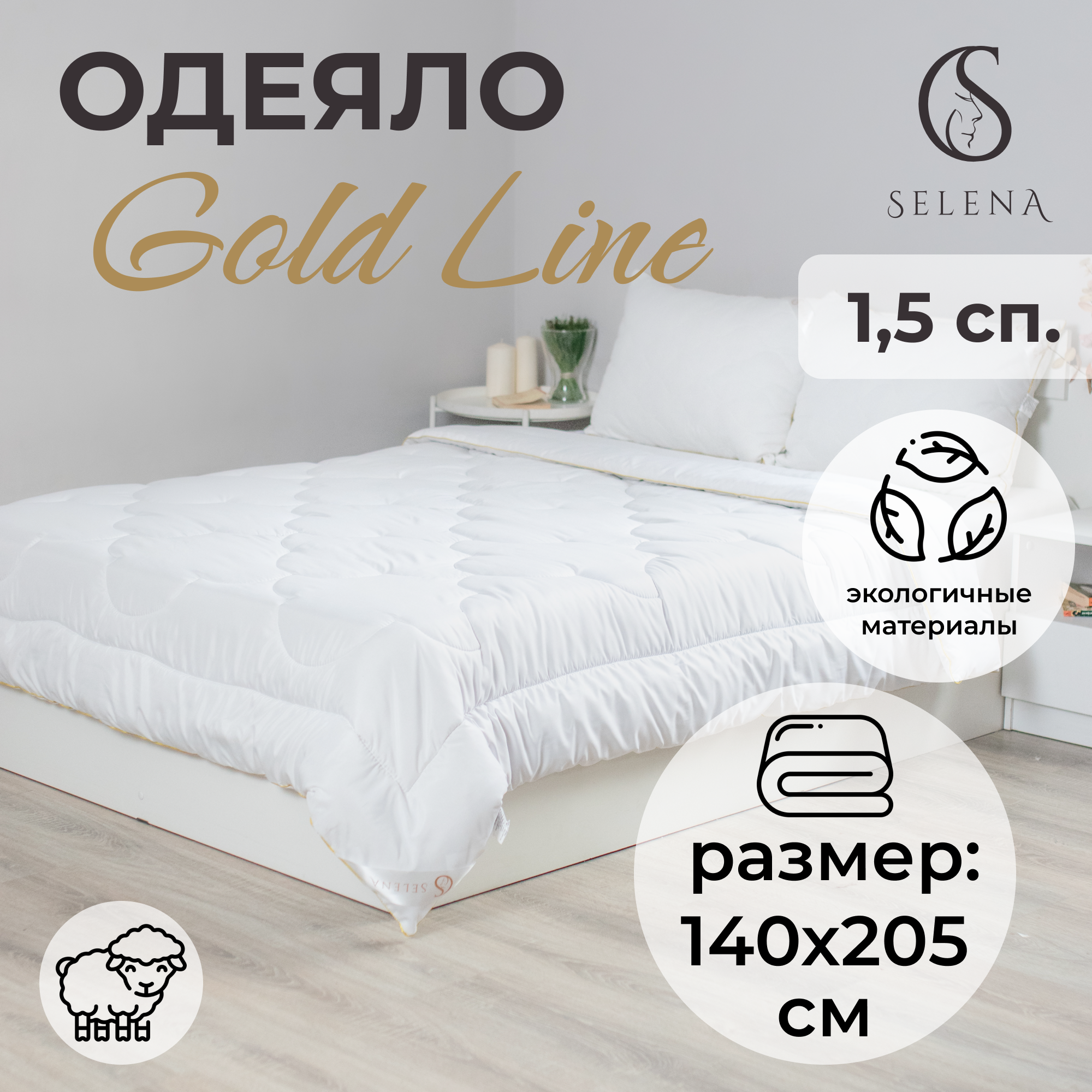 Одеяло SELENA Gold Line 140x205см 1,5сп, Всесезонное, Овечья шерсть, 250г/м²