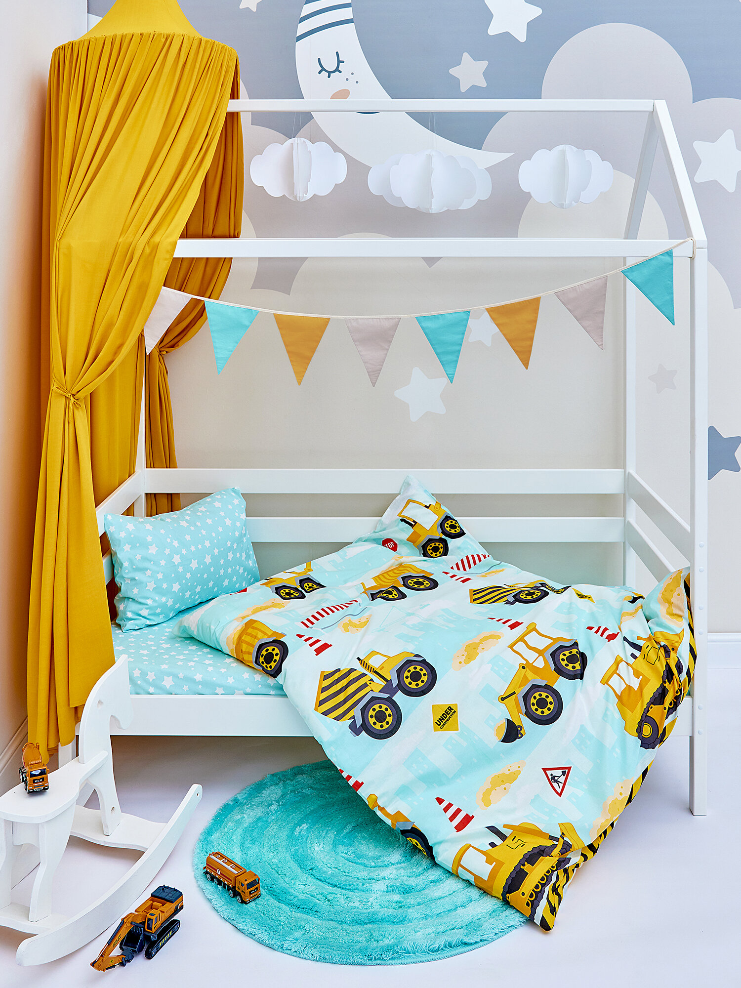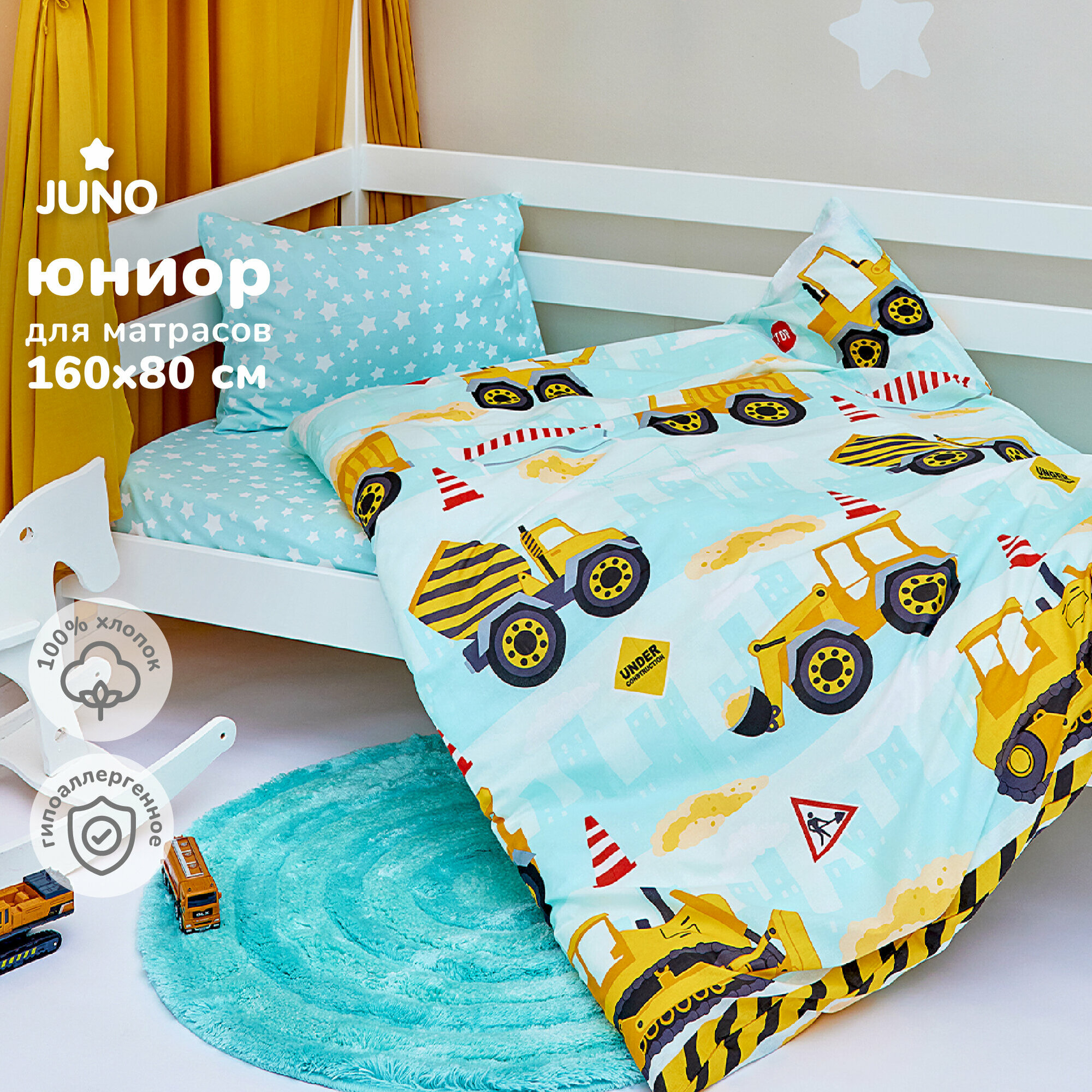 Купить Постельное белье детское 160х80 юниор Juno, поплин хлопок, 1 наволочка 40х60, детское постельное белье в кроватку Машинки Строительный транспорт, комплект для мальчика