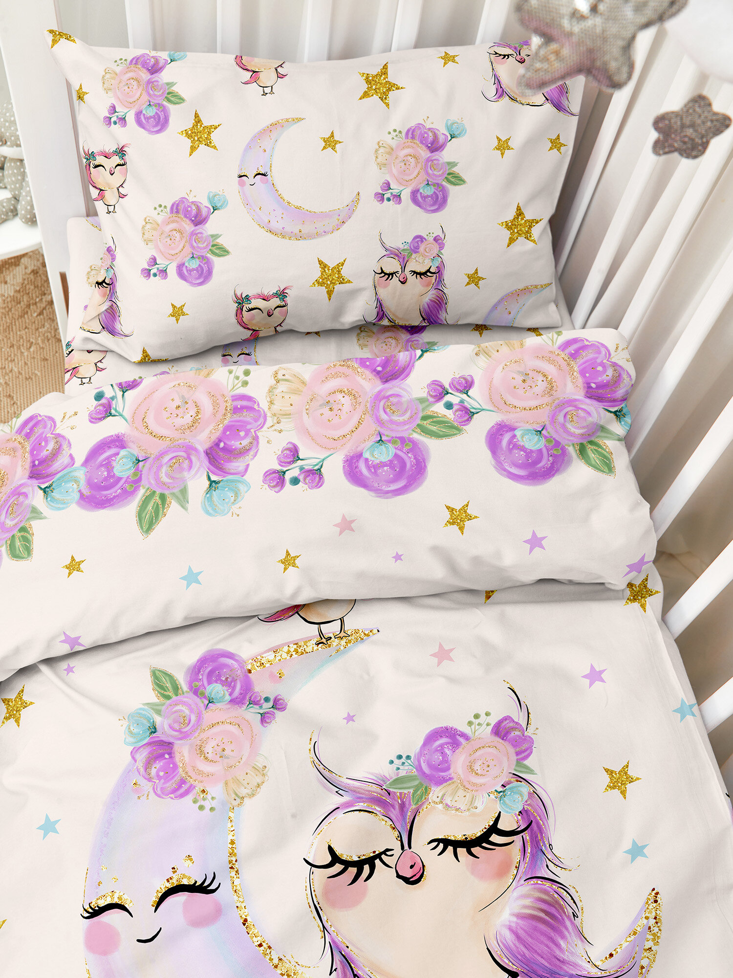 Постельное белье детское 160х80 юниорjuno, поплин хлопок, 1 наволочка 40х60, детское постельное белье в кроватку Sleep Unicorn / Единорог, комплект для малыша, для девочки