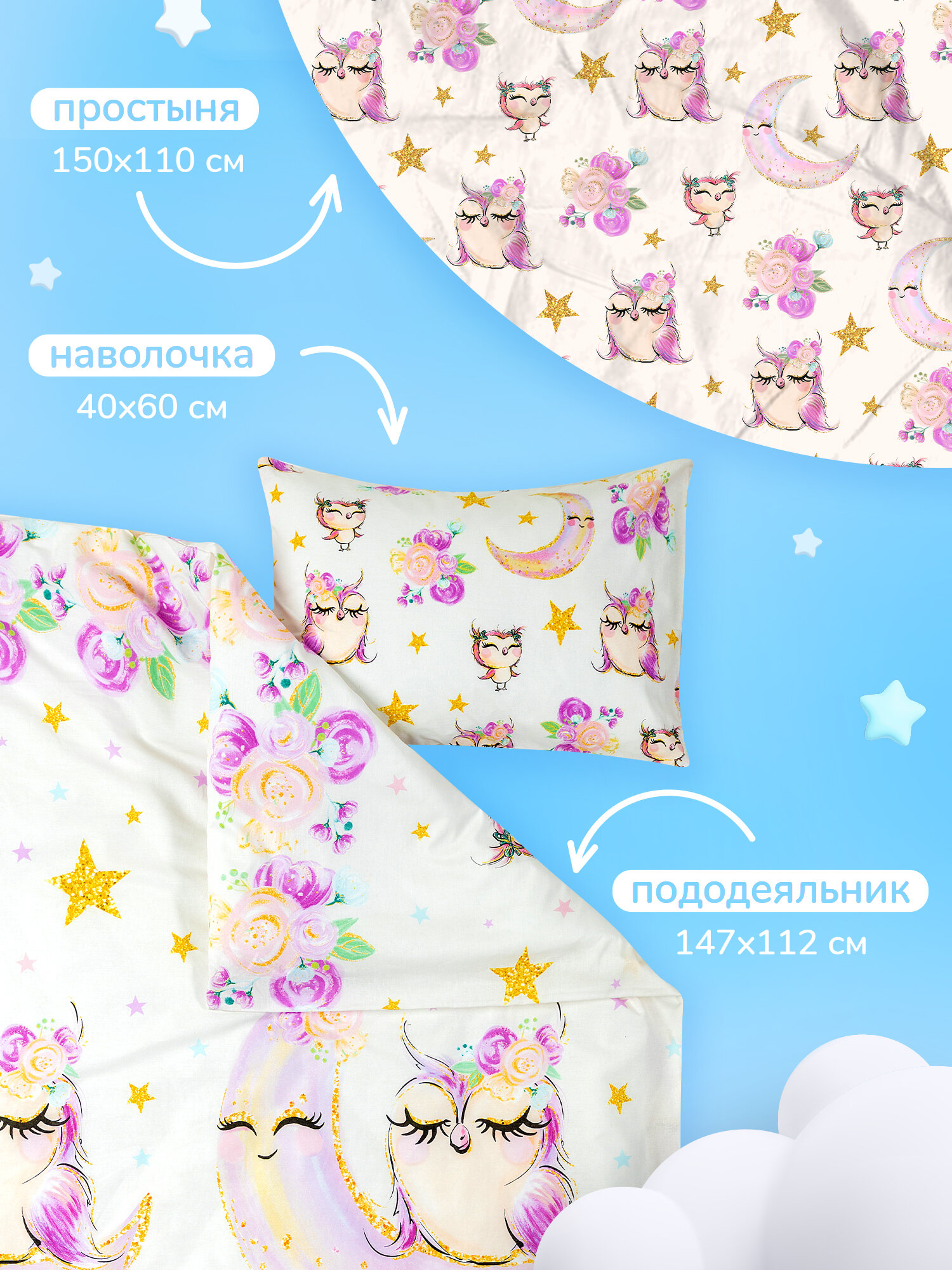Детское постельное белье в кроватку 160х80 Juno, поплин хлопок, 1 наволочка 40х60, постельное белье детское Sleep owls / Спящая совушка, 16422-1/13234-2, простынь на резинке, комплект для девочки