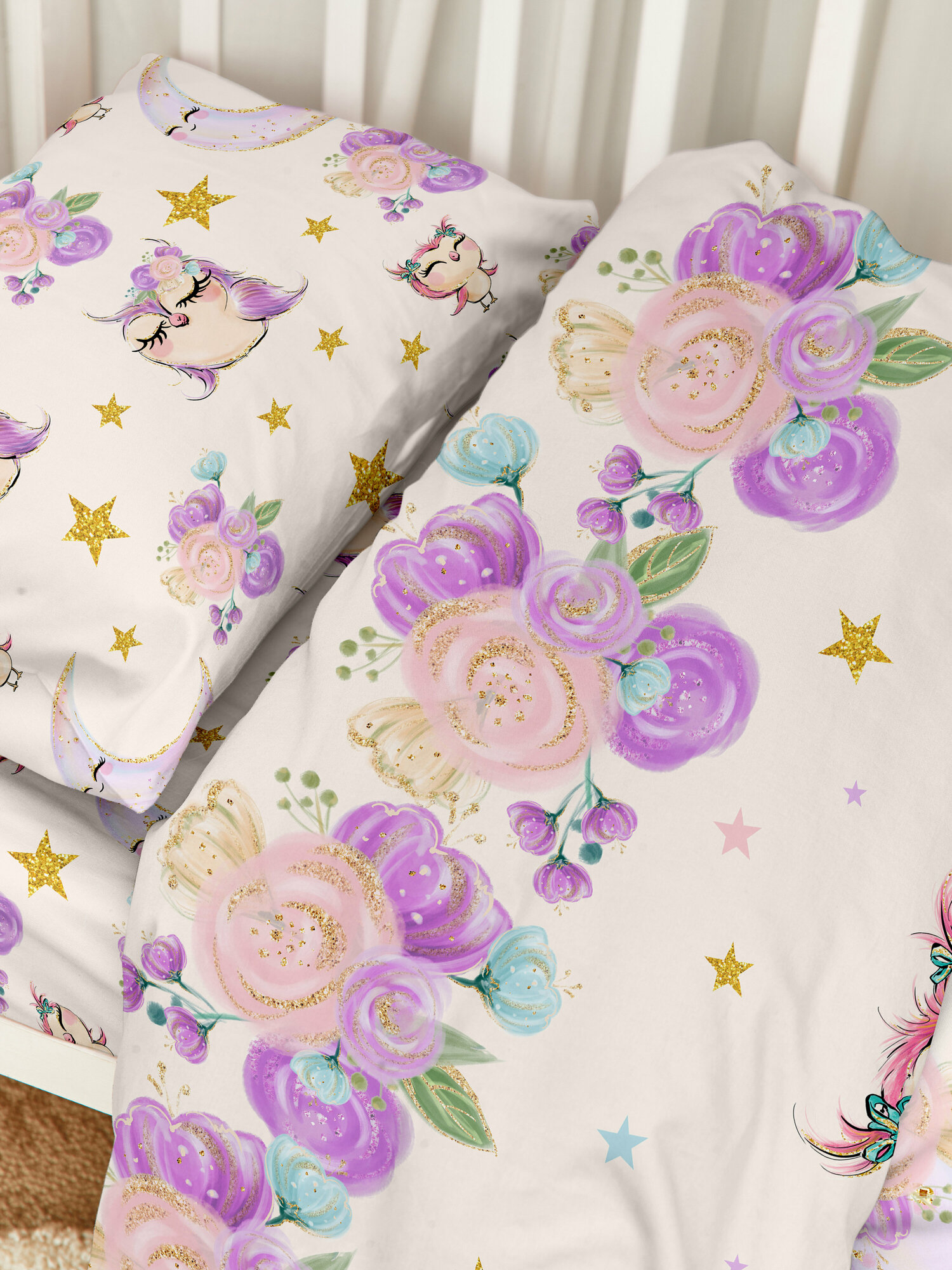 Детское постельное белье в кроватку для новорожденного Juno, поплин хлопок, 1 наволочка 40х60, постельное белье детское Unicorns / Единорожки, комплект для девочки