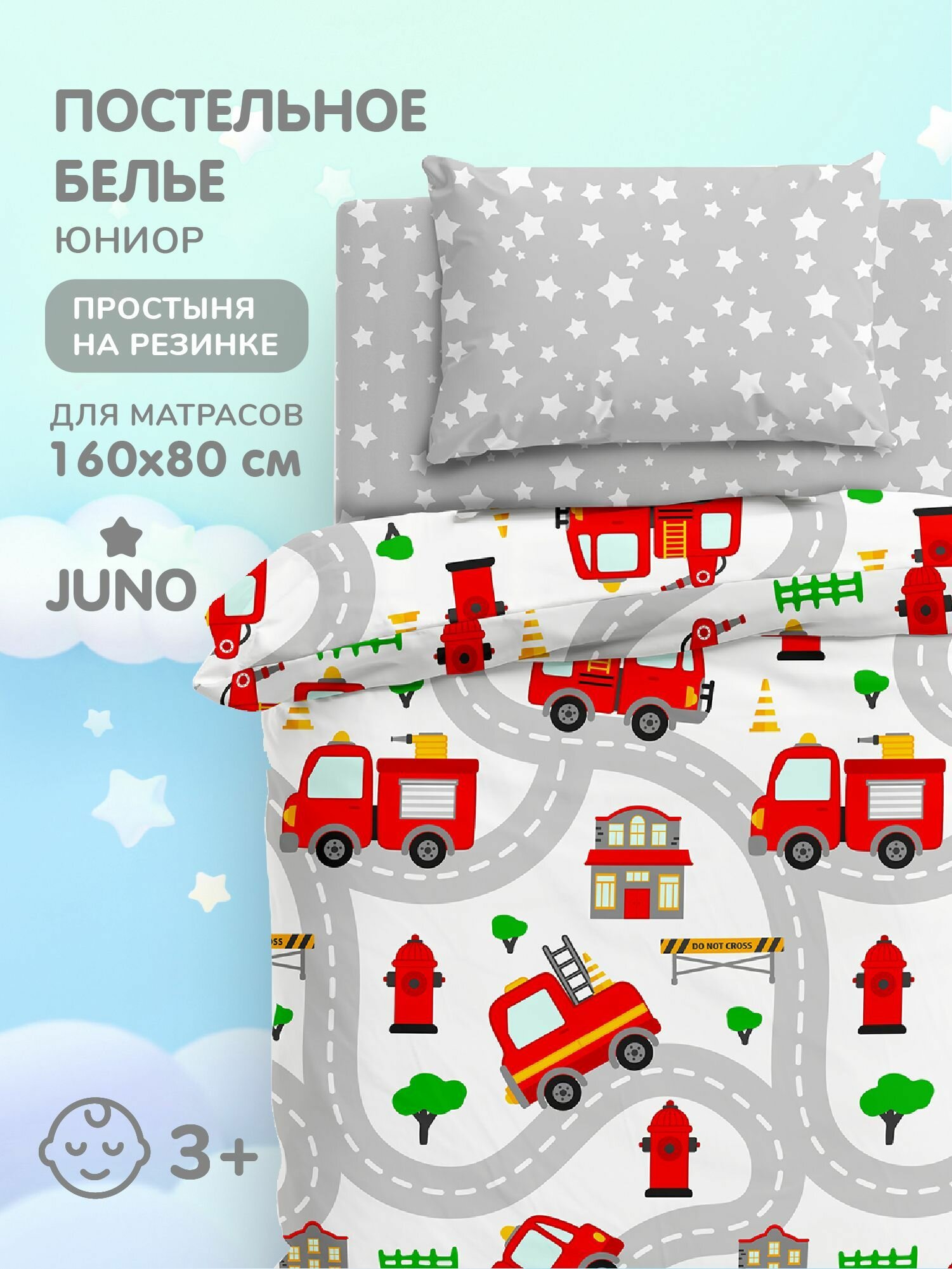 Купить Детское постельное белье в кроватку 160х80 Juno, поплин хлопок, 1 наволочка 40х60, постельное белье детское Пожарные машинки, 16443-1/13165-4, простынь на резинке, комплект для мальчика