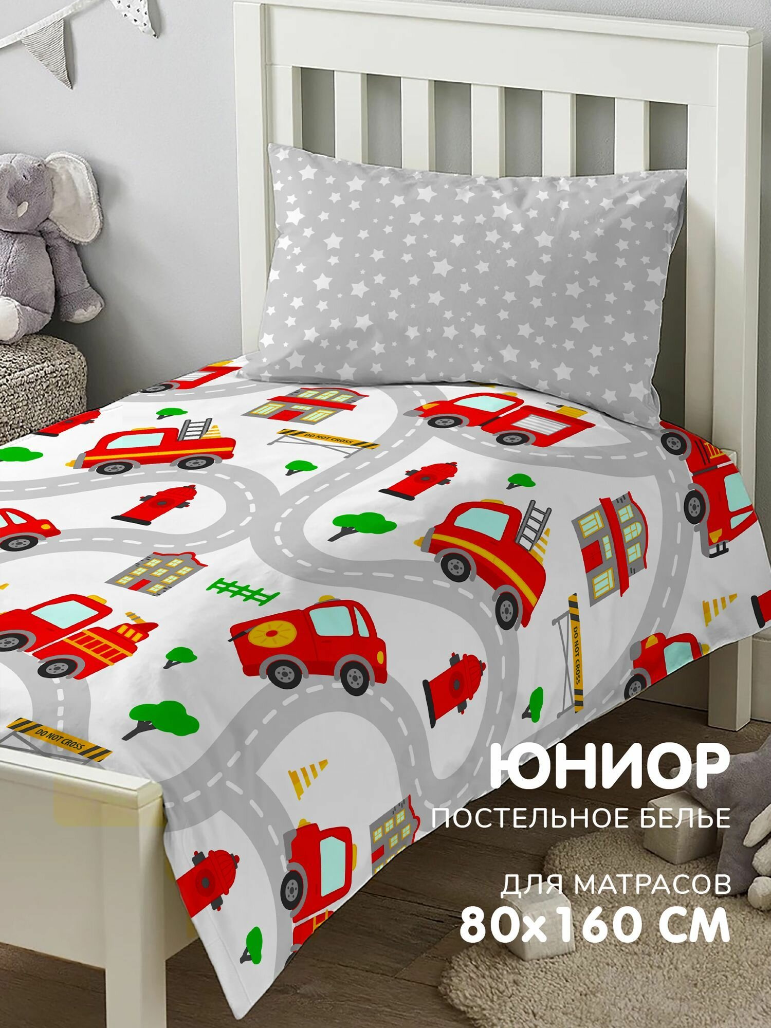 Постельное белье детское 160х80 Juno, поплин хлопок, 1 наволочка 40х60, детское постельное белье в кроватку Пожарные машинки, комплект для мальчика