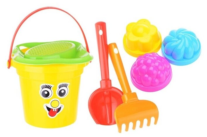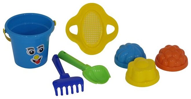Полесье Песочный набор №26: ведро малое 0,53 л, ситечко-цветок, совок, грабельки, 3 формочки для песка, цвета микс