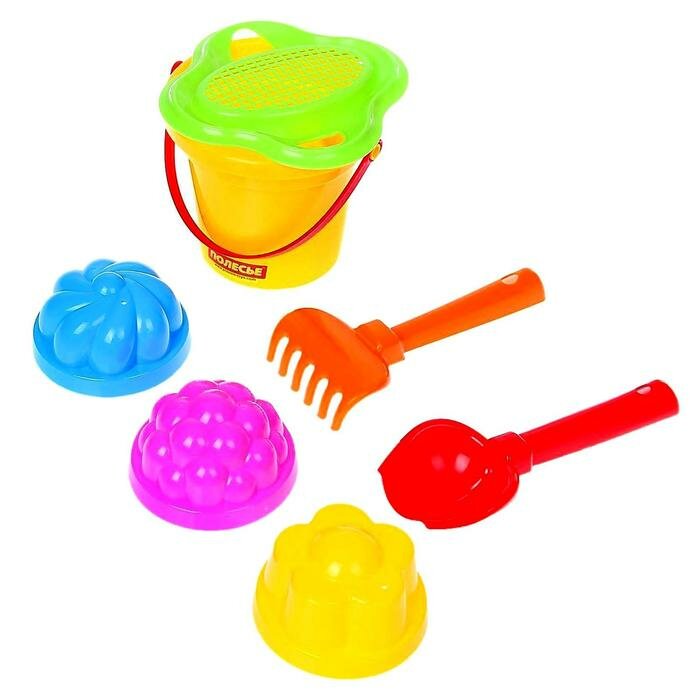 Полесье Песочный набор №26: ведро малое 0,53 л, ситечко-цветок, совок, грабельки, 3 формочки для песка, цвета микс
