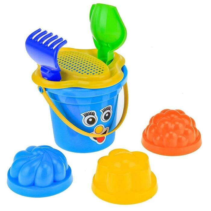 Купить Песочный набор №26: ведро малое 0,53 л, ситечко-цветок, совок, грабельки, 3 формочки для песка, цвета микс