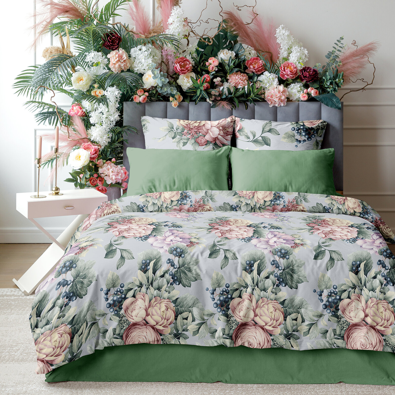 Постельное белье 2 спальное Mia Cara, Перкаль, 4 нав. (50х70-2шт; 70х70-2шт), на резинке, Таинственный сад, зеленый
