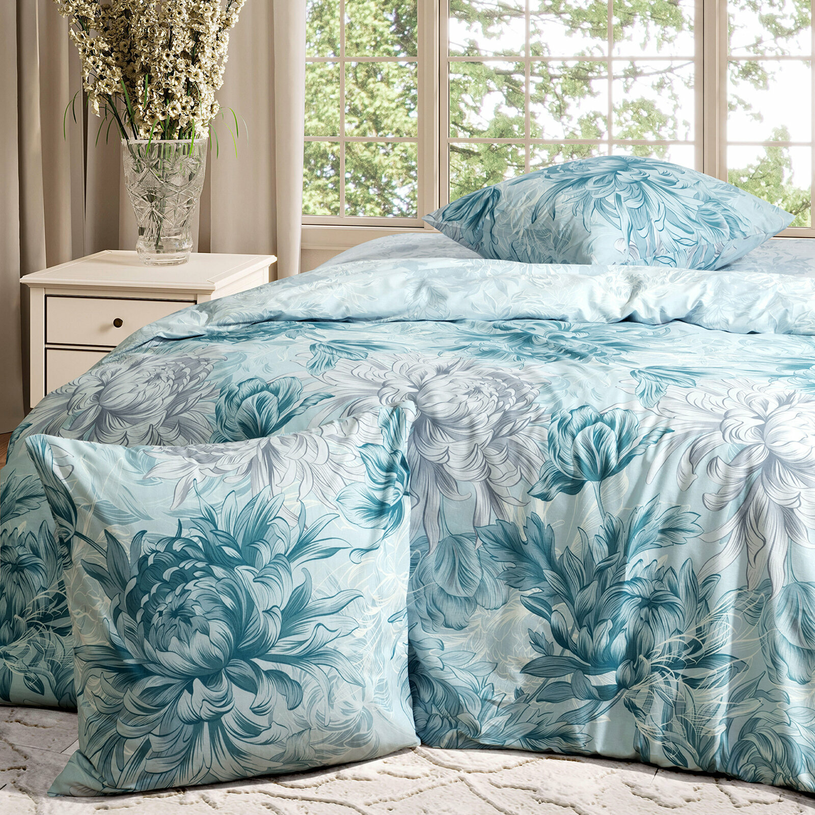 Постельное белье Евро Mia Cara, Перкаль, нав. 70х70, Чарующий сад, пастельно-бирюзовый