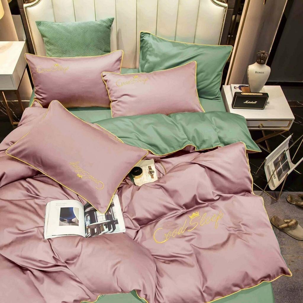 Купить Комплект постельного белья Good Sleep из Сатина Евро Однотонное Хлопок Простыня 220x240 см Розовый Зеленый