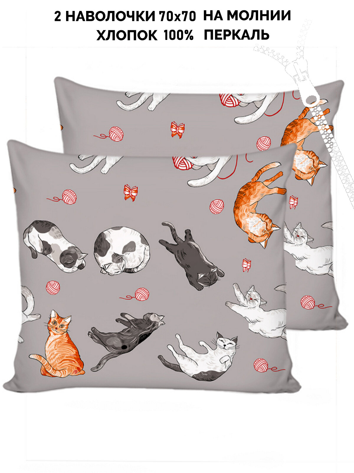 Наволочка 2шт на молнии 70х70 см Сказка "Kitties", ткань перкаль, 100% хлопок