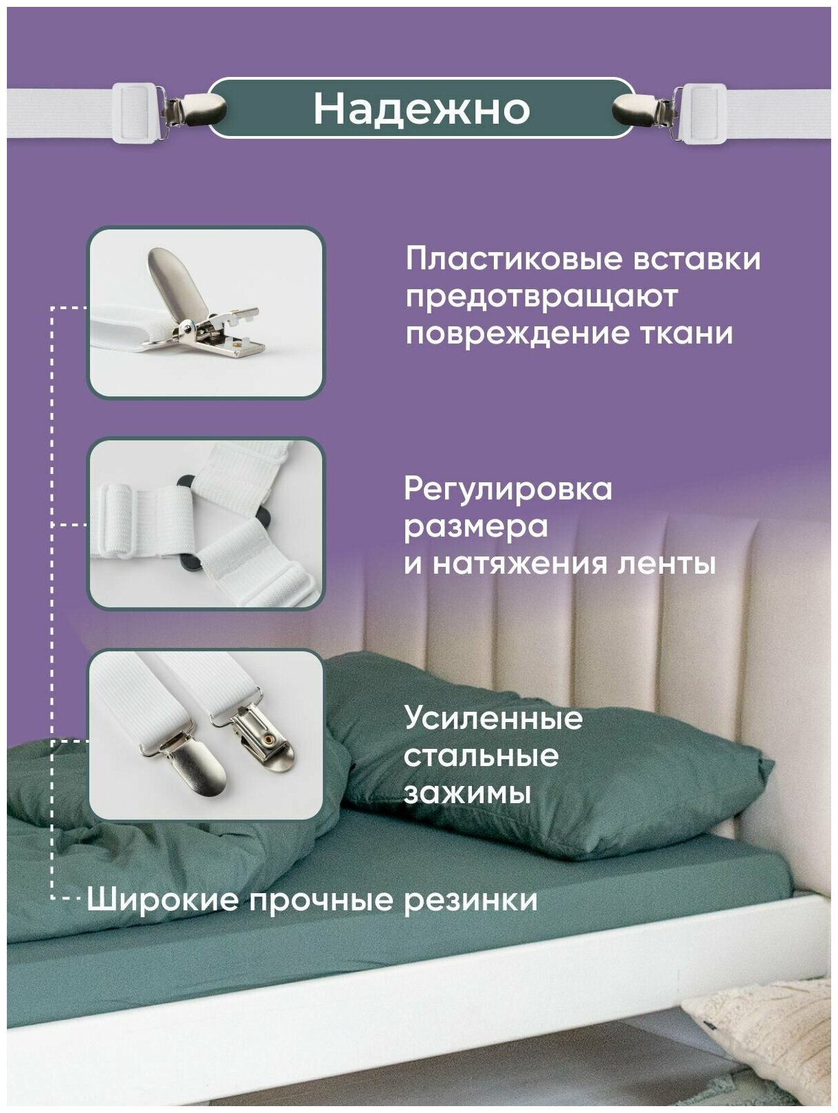 | Дополнительная информация | Регулируются по длине. Подходят для любой простыни, матраса. Можно использовать для гладильной доски, скатерти |