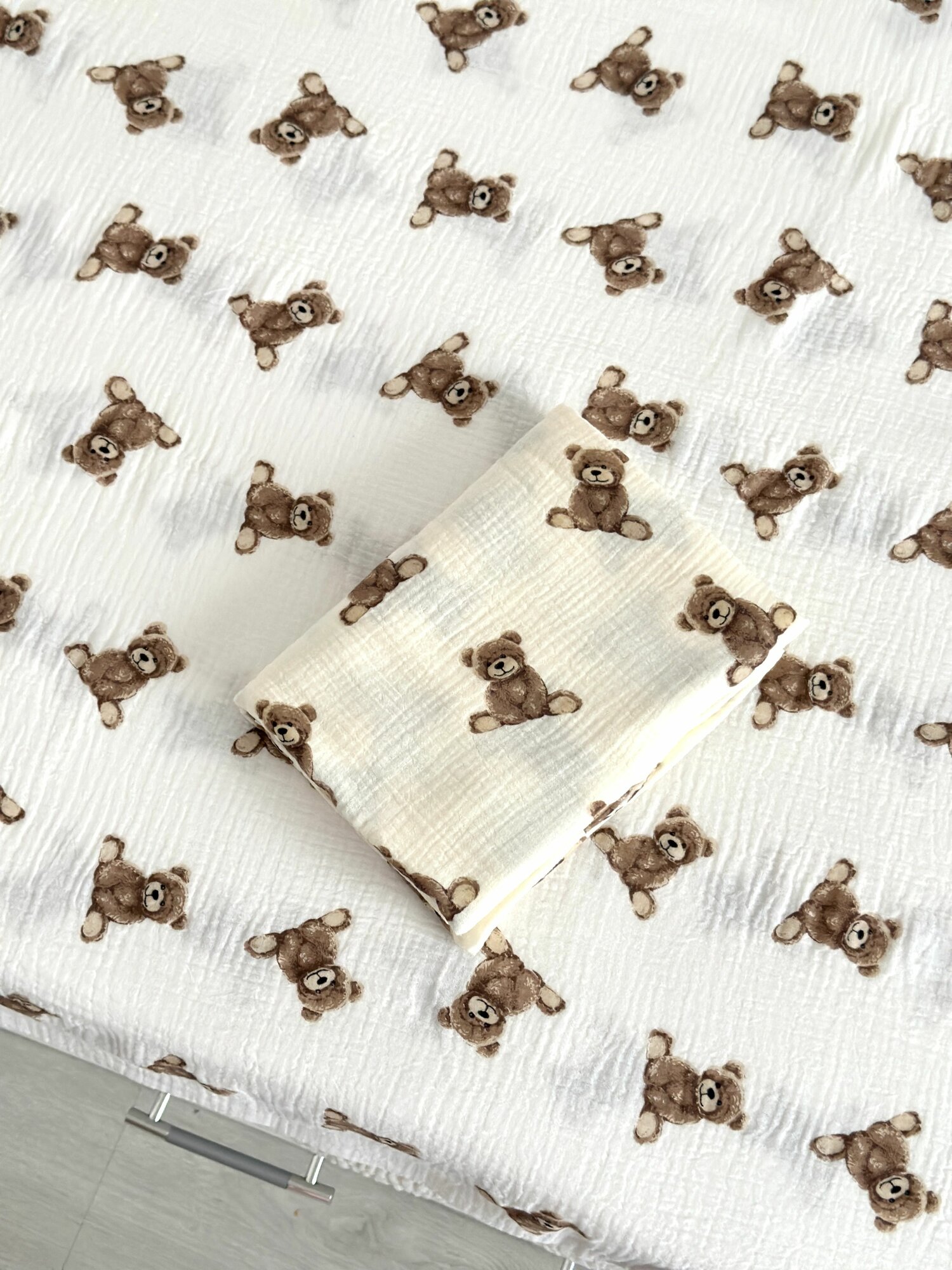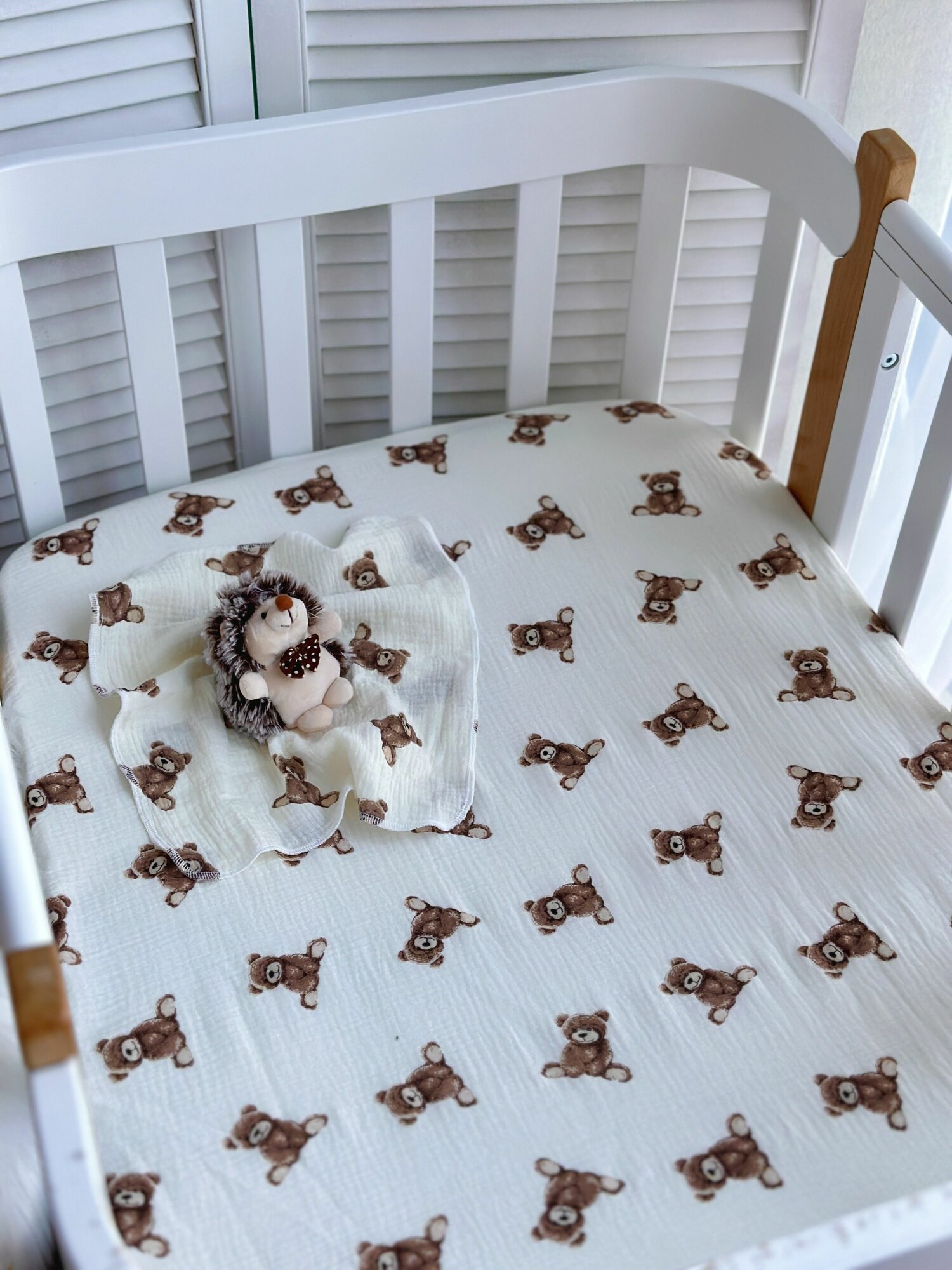 Купить Простынь муслиновая 140х200 1,5 спальная Мишки на молочном фоне
