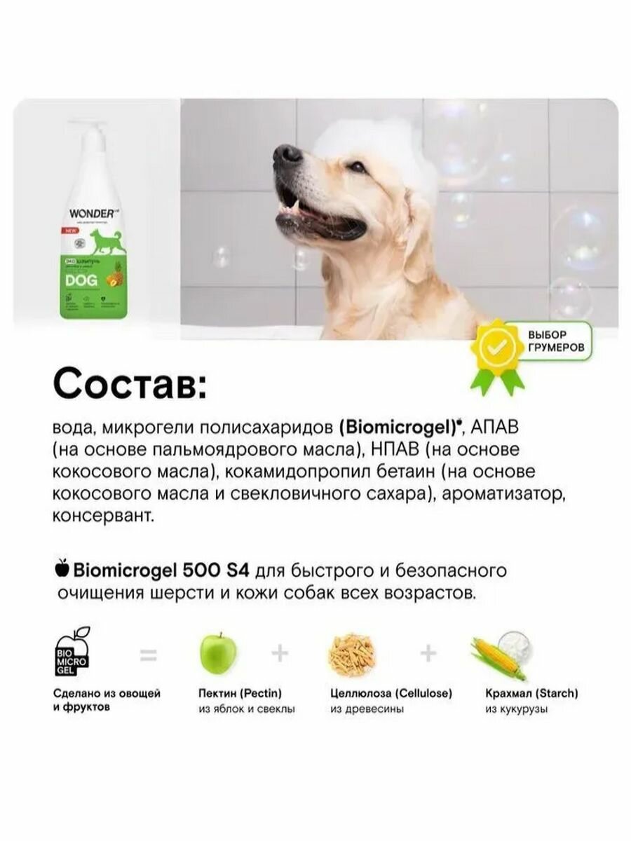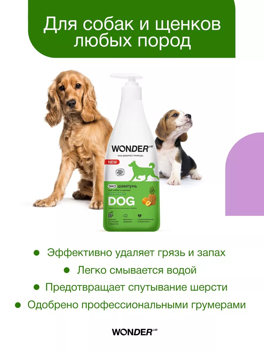 Эко шампунь для собак и щенков гипоаллергенный WONDER LAB, для мытья шерсти и лап длинношерстных и короткошерстных пород, без запаха, 1000 мл