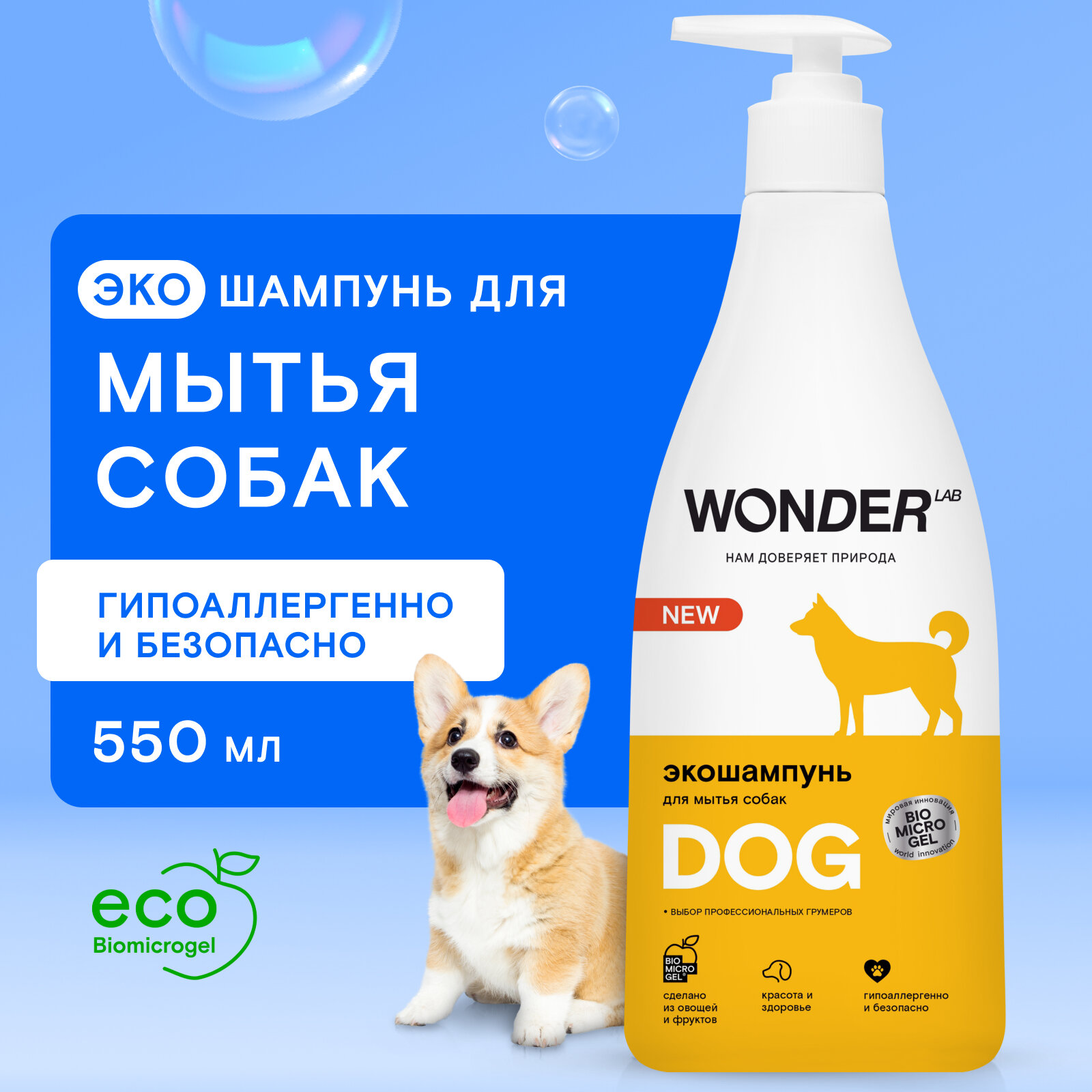 Купить Шампунь для собак и щенков гипоаллергенный WONDER LAB, для мытья шерсти и лап длинношерстных и короткошерстных пород, без запаха, 550 мл