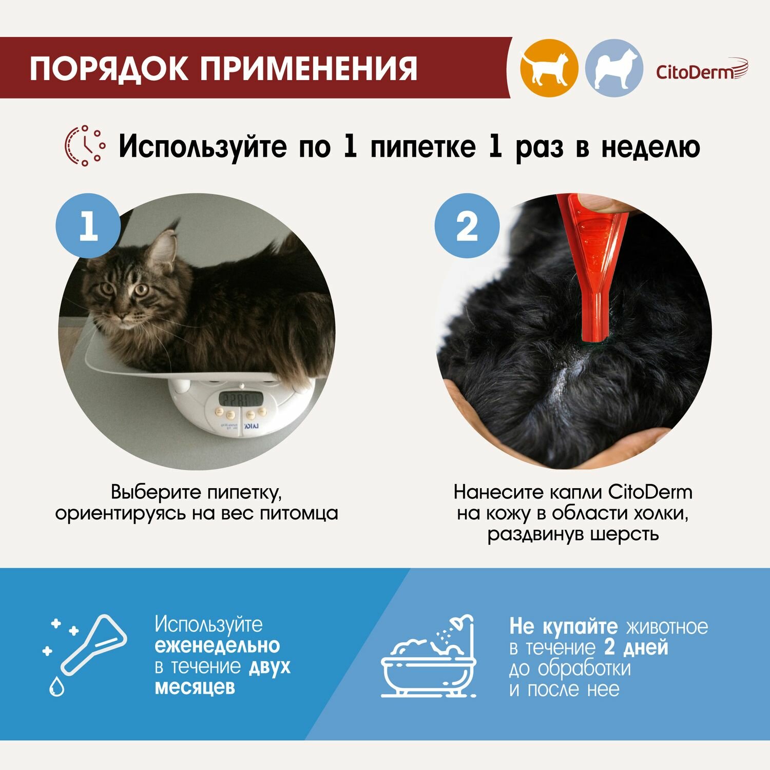 | Способ применения | - не купайте животное в течение 2 дней до обработки и после нее; - нанесите средство в 3–4 местах, недоступных для слизывания: на холку, вдоль позвоночника; - используйте еженедельно в течение двух месяцев; - для закрепления результата продолжайте использовать средство 1 раз в 2 недели; - курс применения не ограничен. |