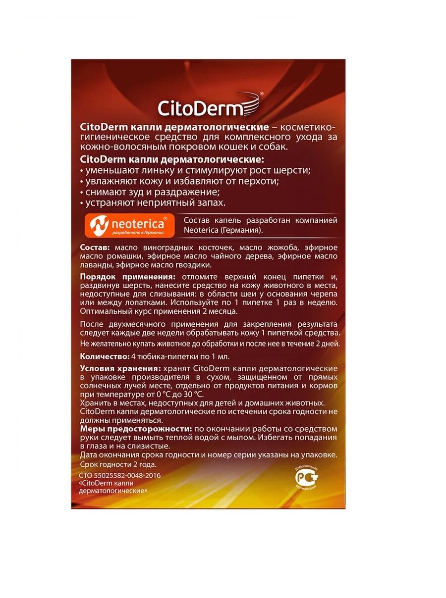 D101 Цитодерм Капли дерматологические д/кошек и собак до 10кг 4пипетки*1мл*16 интересное: