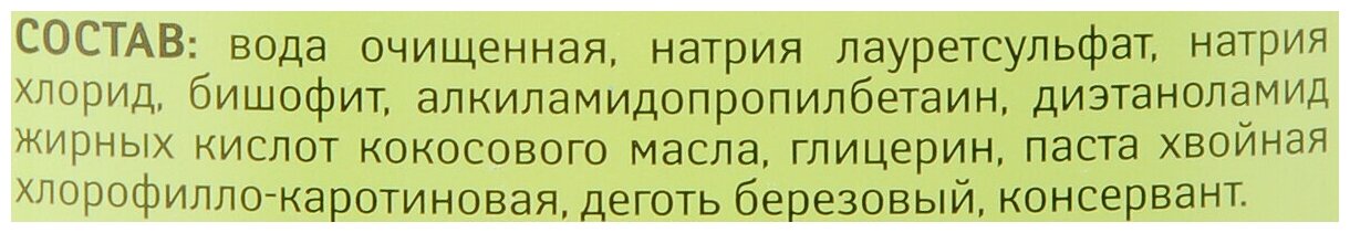 | Состав | вода очищенная, натрия лауретсульфат, натрия хлорид, бишофит, алкиламидопропилбетаин, диэтаноламид жирных кислот кокосового масла, глицерин, паста хвойная хлорофилло-каротиновая, деготь березовый, консервант. |