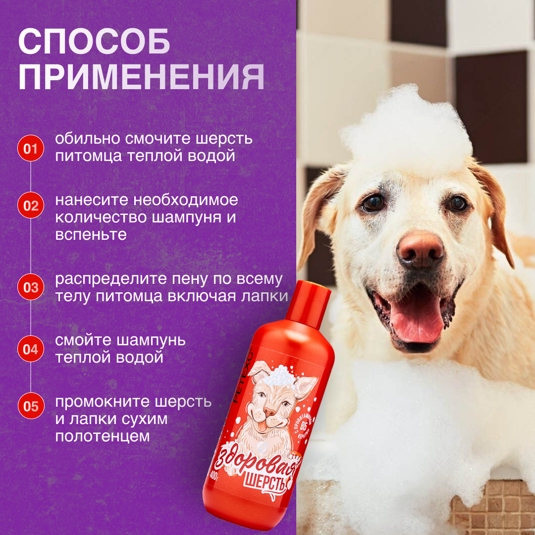 | Способ применения | Перед применением шампуня обильно смочите шерсть собаки теплой водой, нанесите необходимое количество шампуня, вспеньте, распределите пену по всей поверхности тела, после чего тщательно смойте водой. |