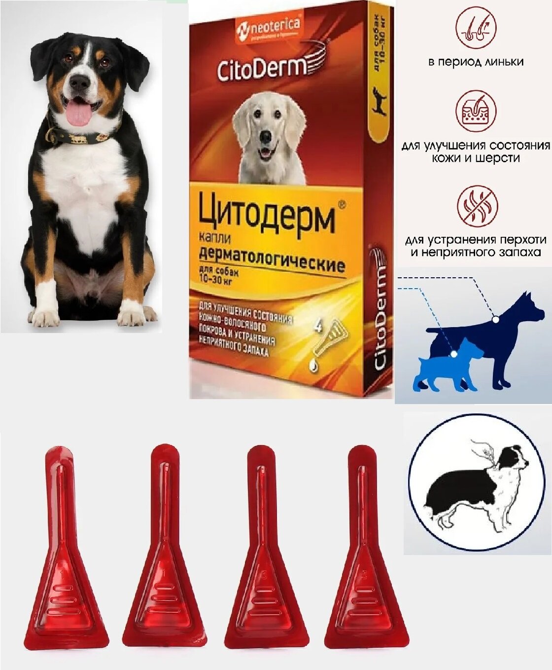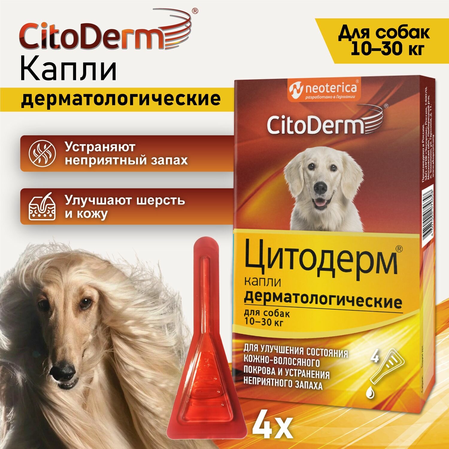 Капли дерматологические для собак 10-30 кг CitoDerm для шерсти и кожи 4 шт х 3 мл