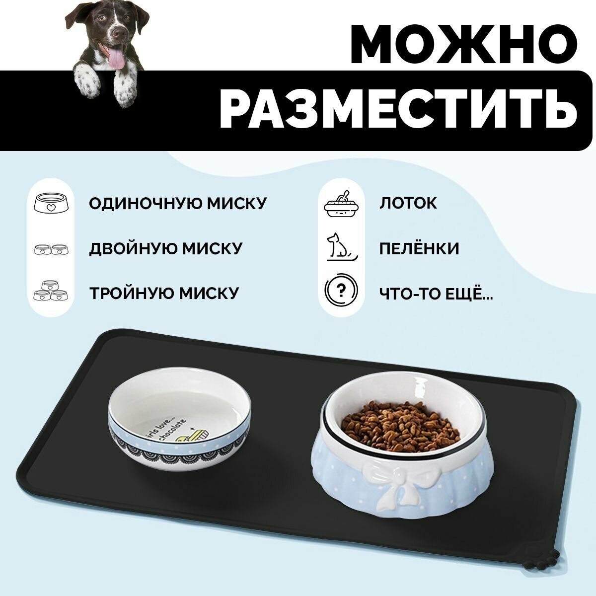 Коврик силиконовый (нескользящий) с бортиками под миску, лоток и поилку для животных черный 48х30 см. интересное: