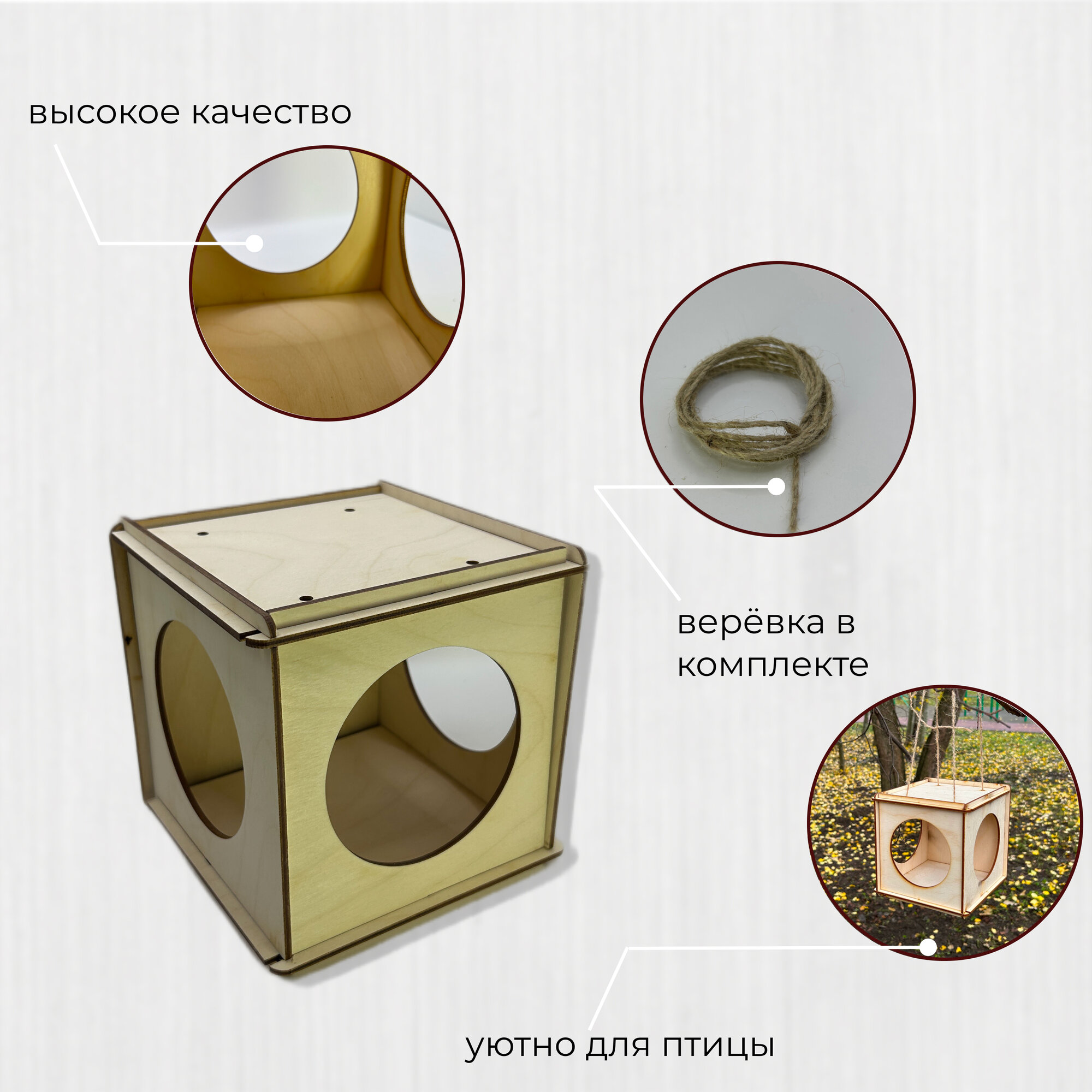| Дополнительная информация | Деревянная прямоугольная закрытая сборная подвесная кормушка весной и летом для корма на дерево с крышей для мелких птиц и грызунов. Верёвка в комплекте. |