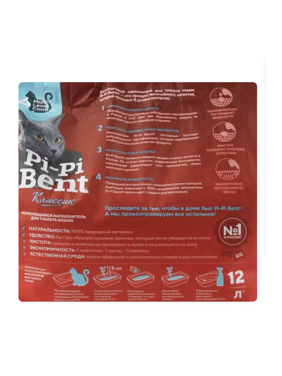 | Дополнительная информация | Pi-Pi-Bent Классик наполнитель для кошачьего туалета комкующийся 5 кг (12 литров). Натуральный комкующийся наполнитель, изготовленный из бентонитовой глины, которая безопасна даже при случайном попадании в организм животного. Специально подобранные гранулы образуют прочные комочки, которые не прилипают к шерсти животного и не вредят нежным кошачьим лапкам. Благодаря способности к комкованию, наполнитель Pi-Pi Bent Классик легко и просто удалить из лотка, не меняя при этом всего содержимого. Следуя природным кошачьим инстинктам, питомец с удовольствием будет пользоваться наполнителем с первого дня применения |