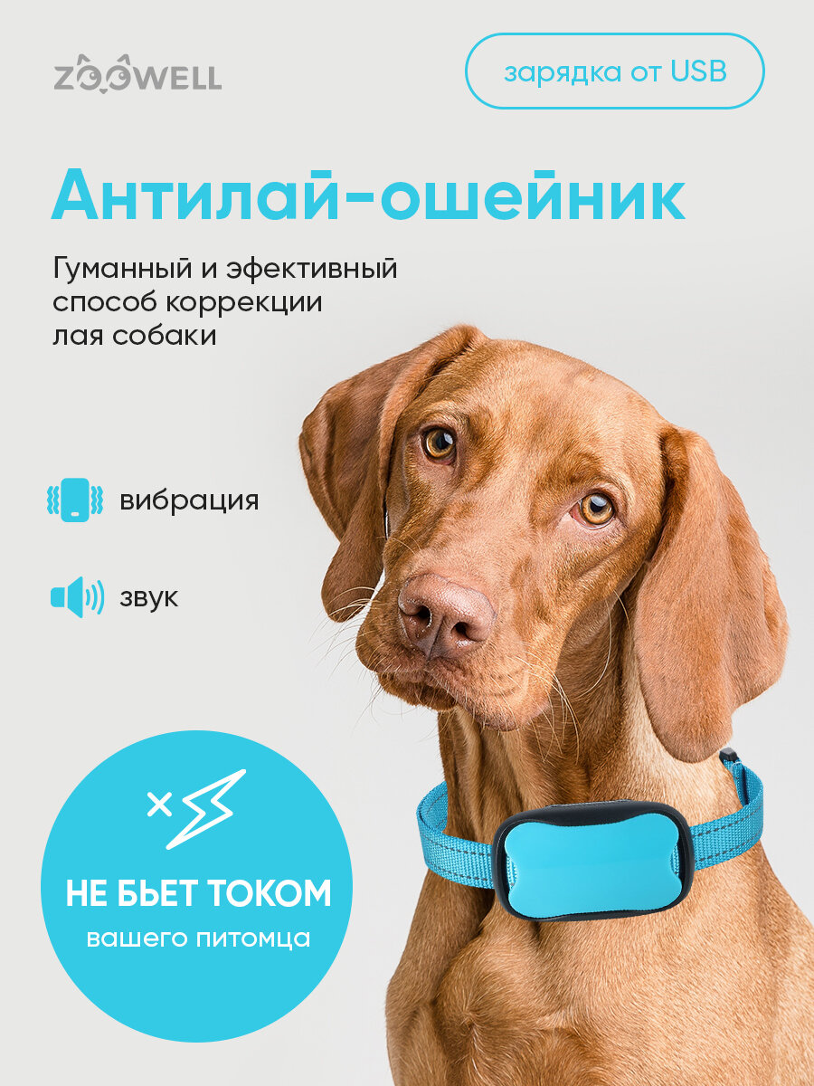 Гуманный Ошейник Антилай вибрация и звук голубой,ошейник для собак, зарядка от USB, ZOOWELL интересное: