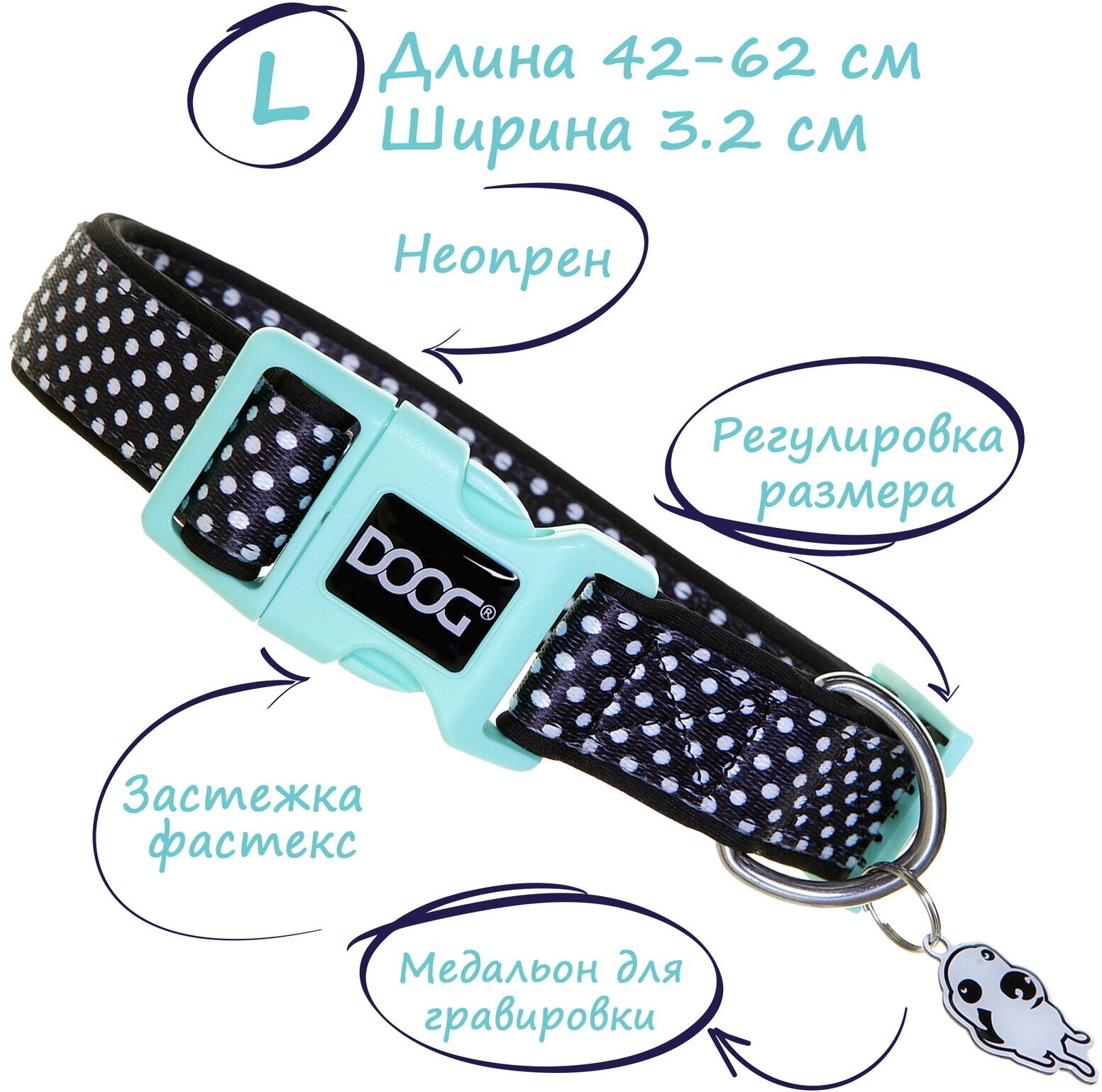СохранитьОшейник для собак DOOG "Pongo" черный в белую крапинку 42-62см L (Австралия) интересное: