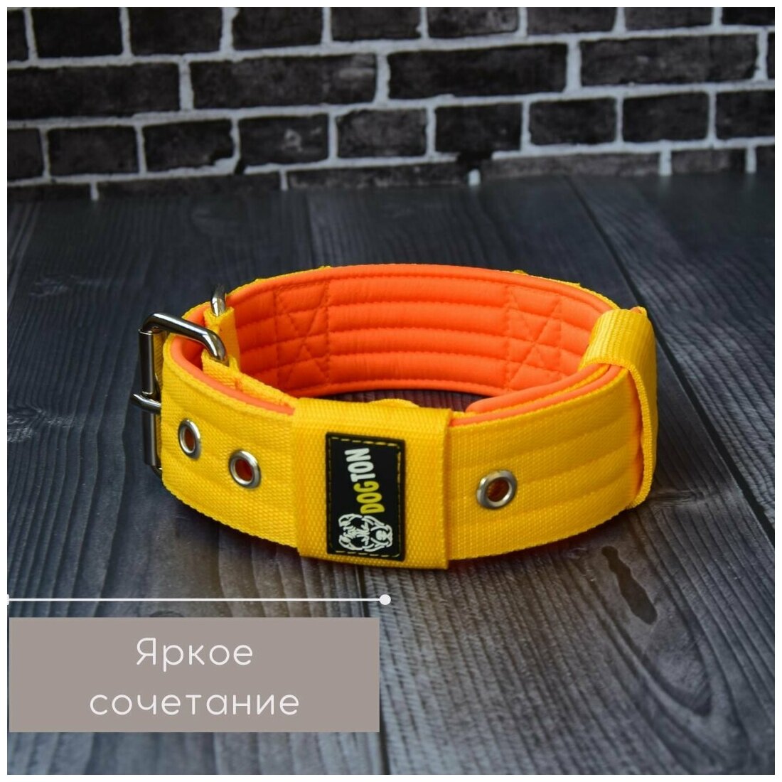 Ошейник для средних собак с усиленной пряжкой широкий DOGTON. Ширина 5 см. Обхват 53-65 см. Цвет серый с желтым
