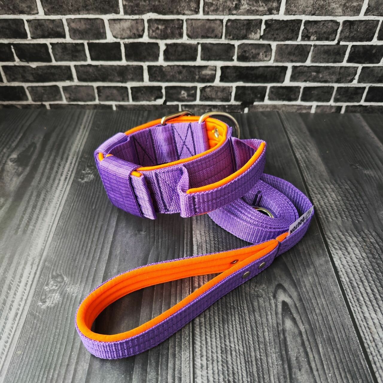 Комплект ошейник и поводок. Поводок 1.5 метра с мягкой ручкой. Для собак средних и крупных пород. Ширина ошейника 5.5 см. Обхват шеи 35-47 см.