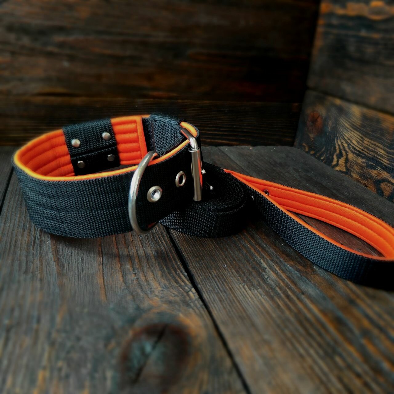 Комплект ошейник, поводок 1.5 метра с ручкой "перехват". Для собак средних и крупных пород. Ширина ошейника 5.5 см. Обхват шеи 35-47 см.