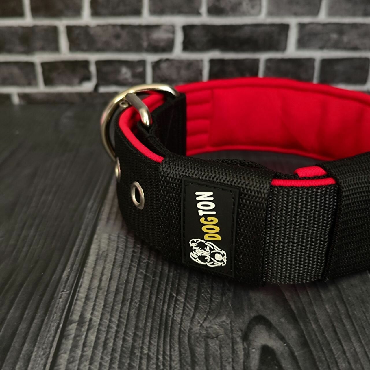 Ошейник для собак Dogton широкий 5.5 см. Подходит для щенков и взрослых собак. Для ежедневных прогулок, занятия спортом и дрессировки. Обхват шеи 53-65 см. Цвет черный с красным подкладом.