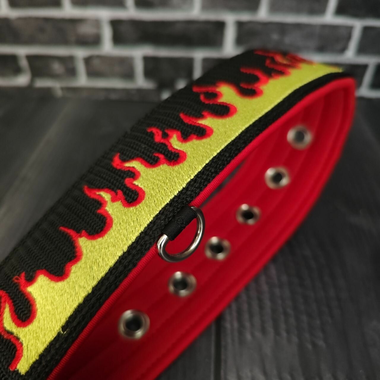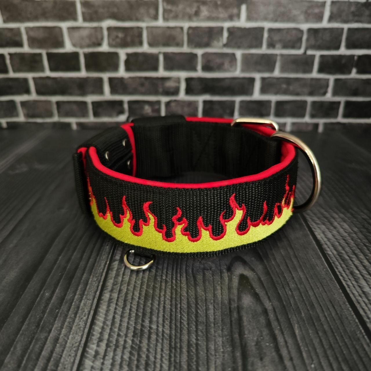 Купить Широкий ошейник с вышивкой "Огонь" для собак, с принтом, с рисунком для собак крупных и средних пород от DOGTON. Ширина 5.5 см. Обхват шеи 53-65 см.