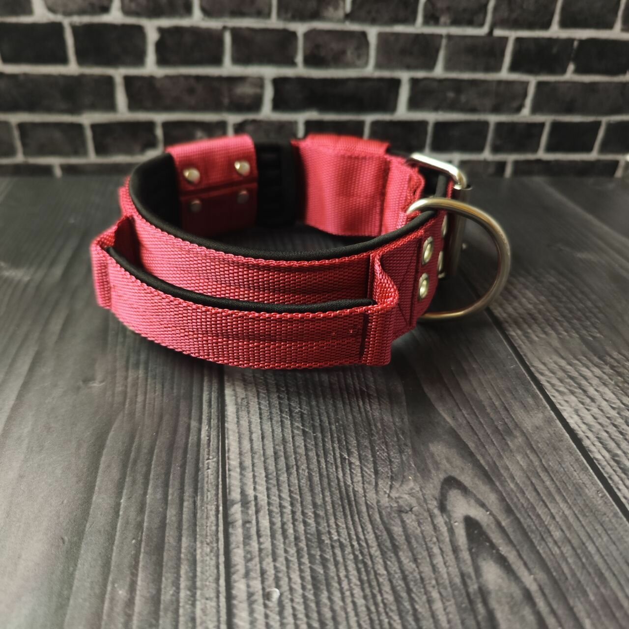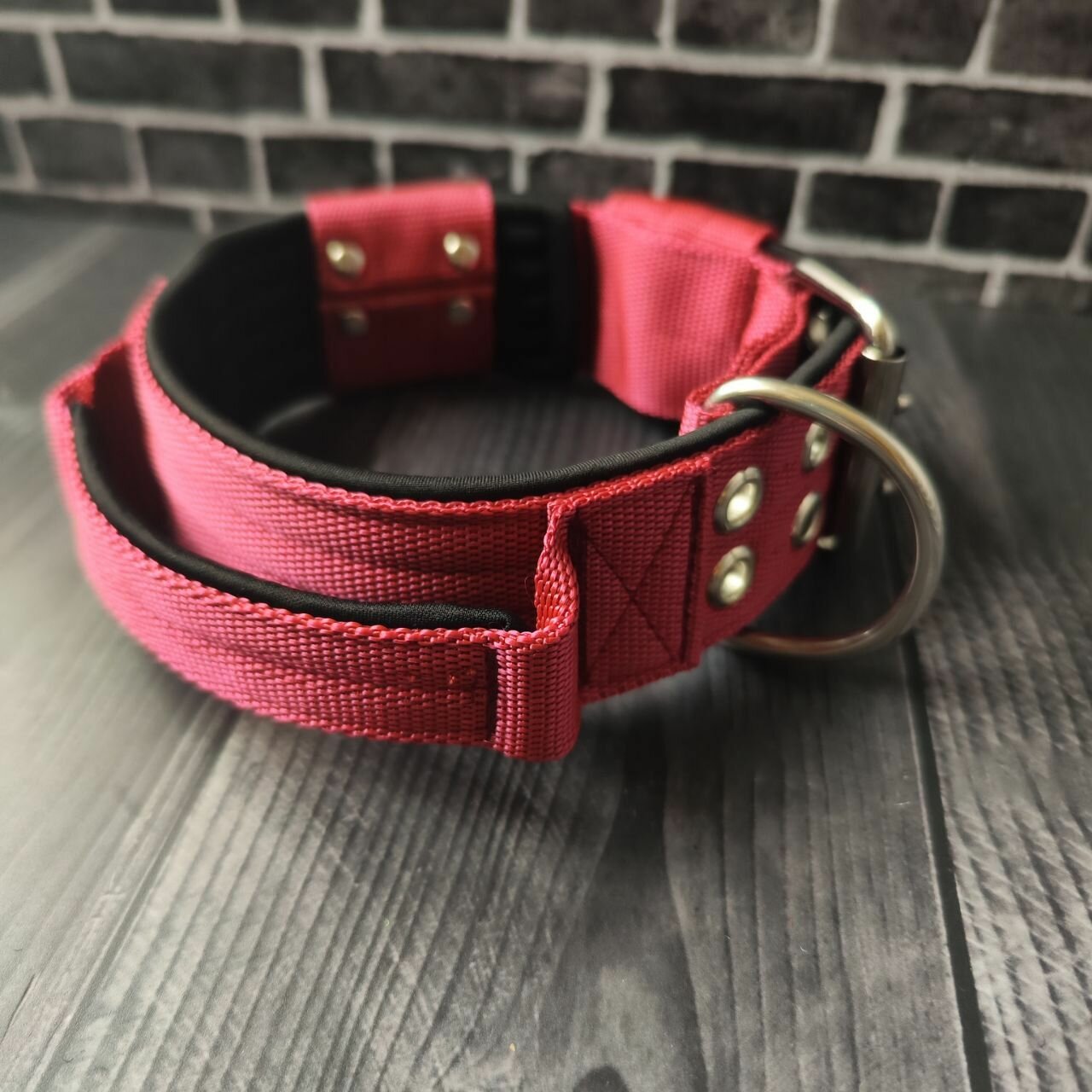 Купить Ошейник для собак с ручкой. Ширина 5.5 см. Сварная фурнитура. Обхват 53-65 см. Цвет бордовый с черным подкладом.